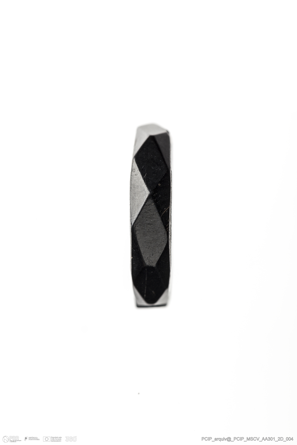 Matéria/Técnica: Azeviche; Cronologia: Século XVI-Século XVII; Autoria: Desconhecida; Dimensões: Diâmetro: 17,5mm; Altura: 40,4mm.