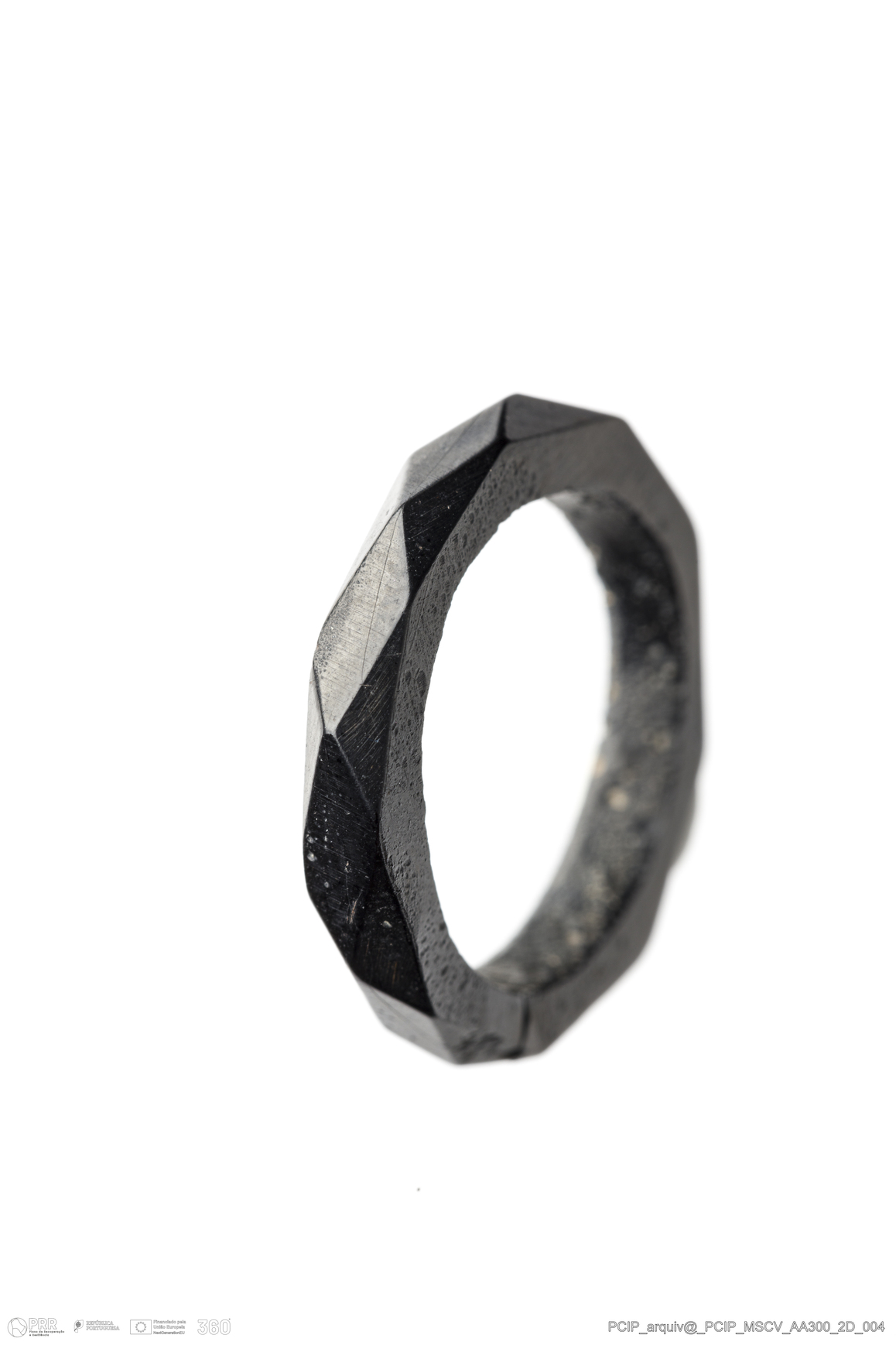 Matéria/Técnica: Azeviche; Cronologia: Século XVI-Século XVII; Autoria: Desconhecida; Dimensões: Diâmetro: 21,5mm; Altura: 3mm.