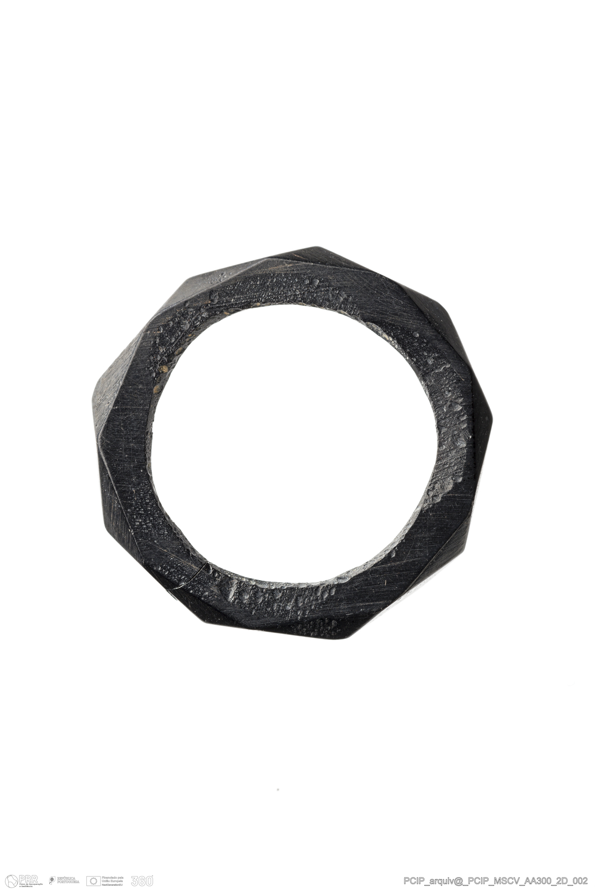 Matéria/Técnica: Azeviche; Cronologia: Século XVI-Século XVII; Autoria: Desconhecida; Dimensões: Diâmetro: 21,5mm; Altura: 3mm.