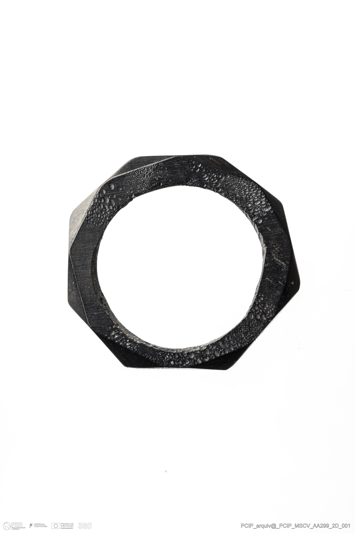 Matéria/Técnica: Azeviche; Cronologia: Século XVI-Século XVII; Autoria: Desconhecida; Dimensões: Diâmetro: 20mm; Altura: 3,5mm.