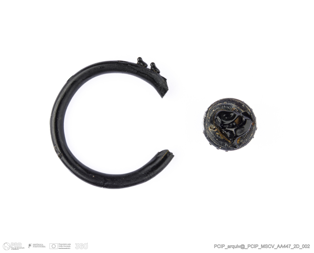 Matéria/Técnica: Vidro; Cronologia: Século XVI- XVII; Autoria: Desconhecida; Dimensões: Diâmetro máximo: 21mm; Largura: 9mm; Espessura: 10mm.