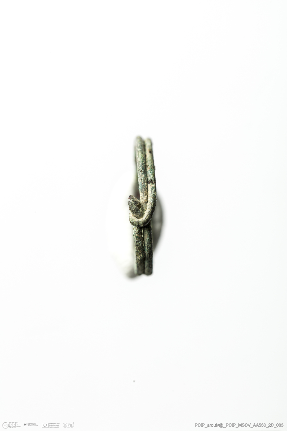 Matéria/Técnica: Metal; Cronologia: Século XVI- XVII; Autoria: Desconhecida; Dimensões: Diâmetro máxima:12mm Altura máxima:3mm Espessura máxima:1mm.