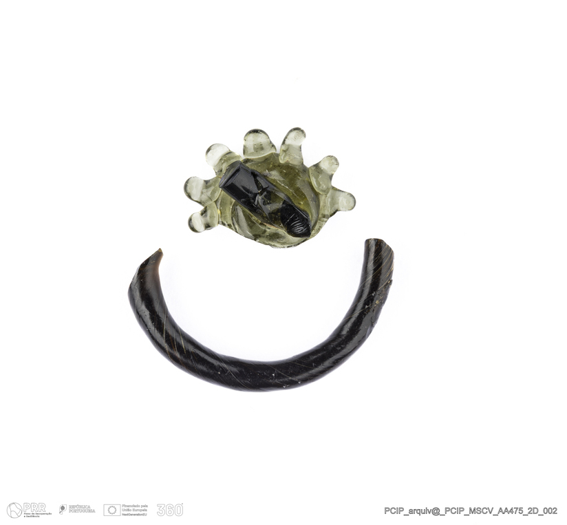 Matéria/Técnica: Vidro; Cronologia: Século XVI- XVII; Autoria: Desconhecida; Dimensões: Diâmetro máximo: 22mm; Altura: 9mm; Espessura: 4mm.