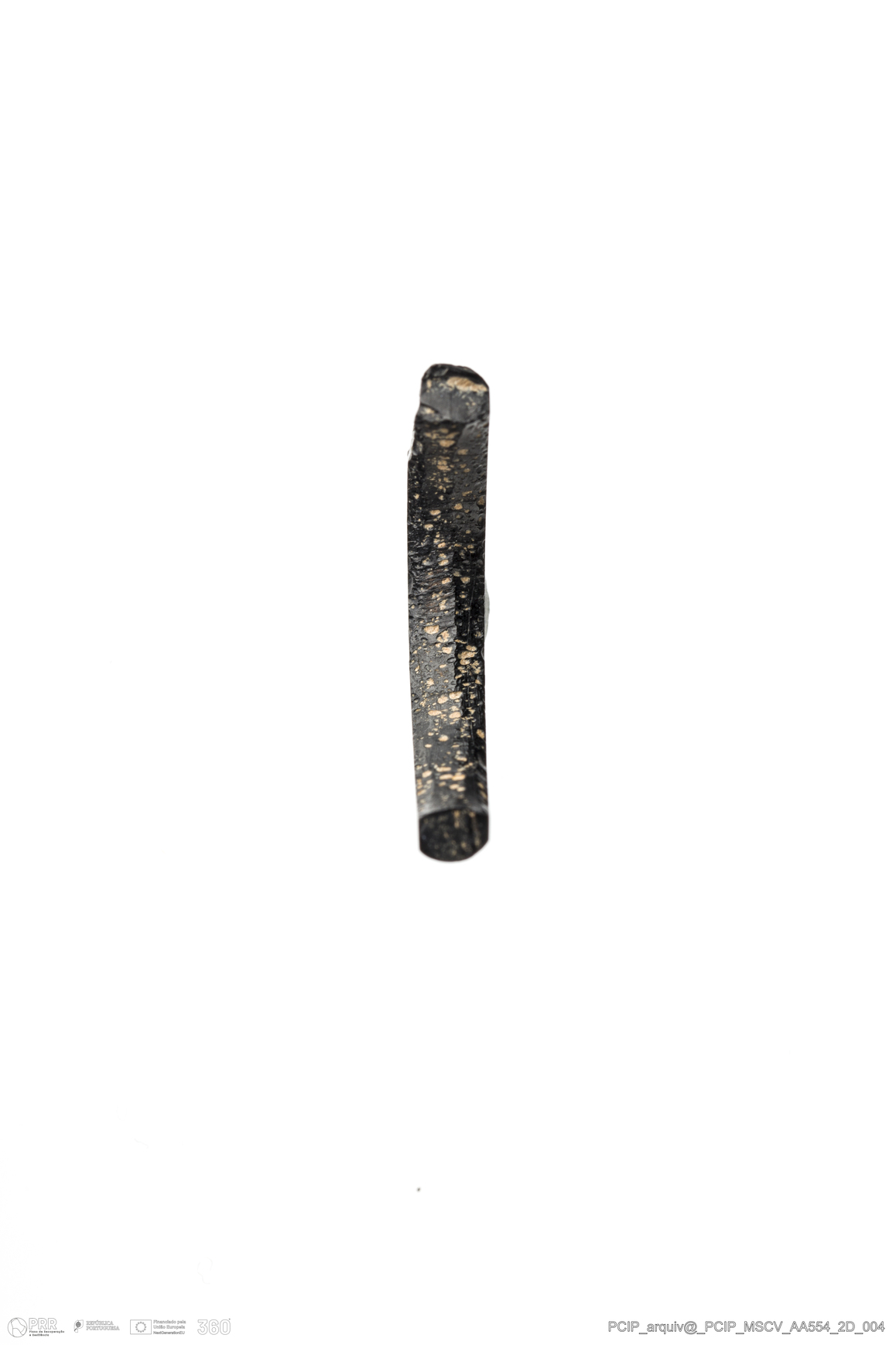 Matéria/Técnica: Azeviche; Cronologia: Século XVI- XVII; Autoria: Desconhecida; Dimensões: Altura máxima:3mm Espessura máxima:2mm.