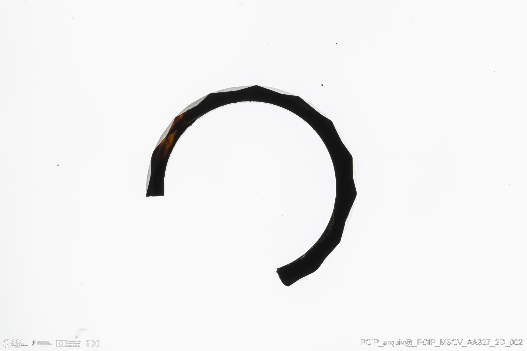 Matéria/Técnica: Vidro; Cronologia: Século XVI- XVII; Autoria: Desconhecida; Dimensões: Diâmetro máximo: 22mm; Altura: 4mm; Espessura: 2mm.