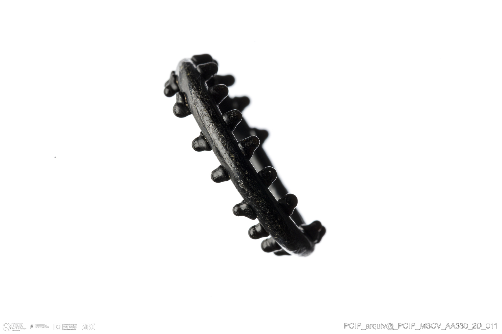 Matéria/Técnica: Vidro; Cronologia: Século XVI-XVII; Autoria: Desconhecida; Dimensões: Diâmetro: 19mm; Altura do aro: 3mm.