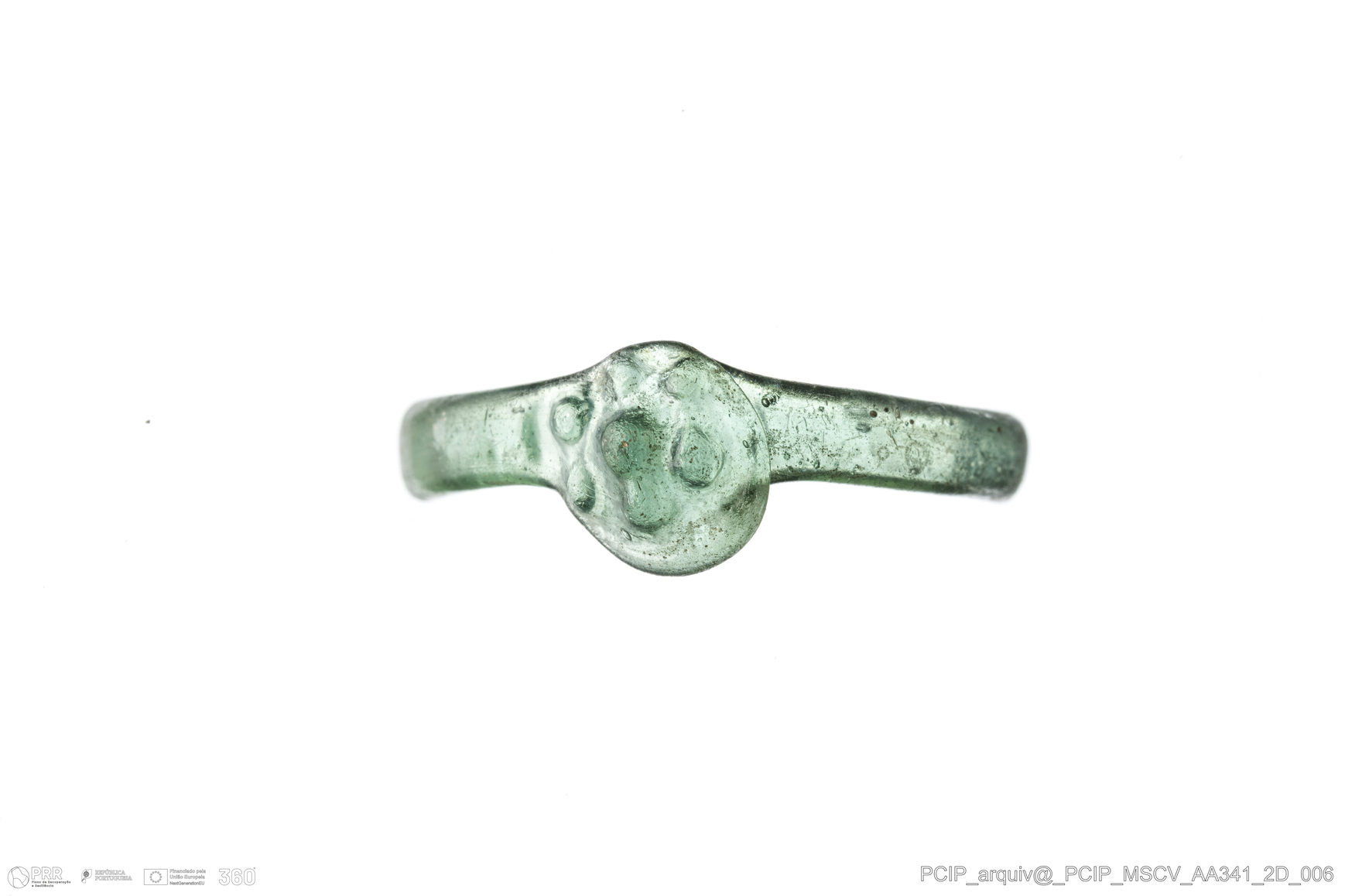 Matéria/Técnica: Vidro; Cronologia: Século XVI- XVII; Autoria: Desconhecida; Dimensões: Diâmetro: 19mm; Espessura: 12mm.