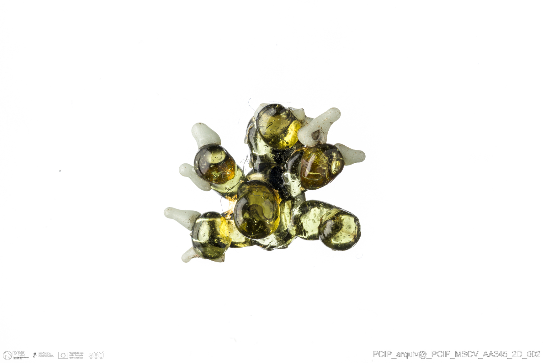 Matéria/Técnica: Vidro; Cronologia: Século XVI- XVII; Autoria: Desconhecida; Dimensões: Comprimento: 16mm; Largura: 13mm; Altura: 5mm.