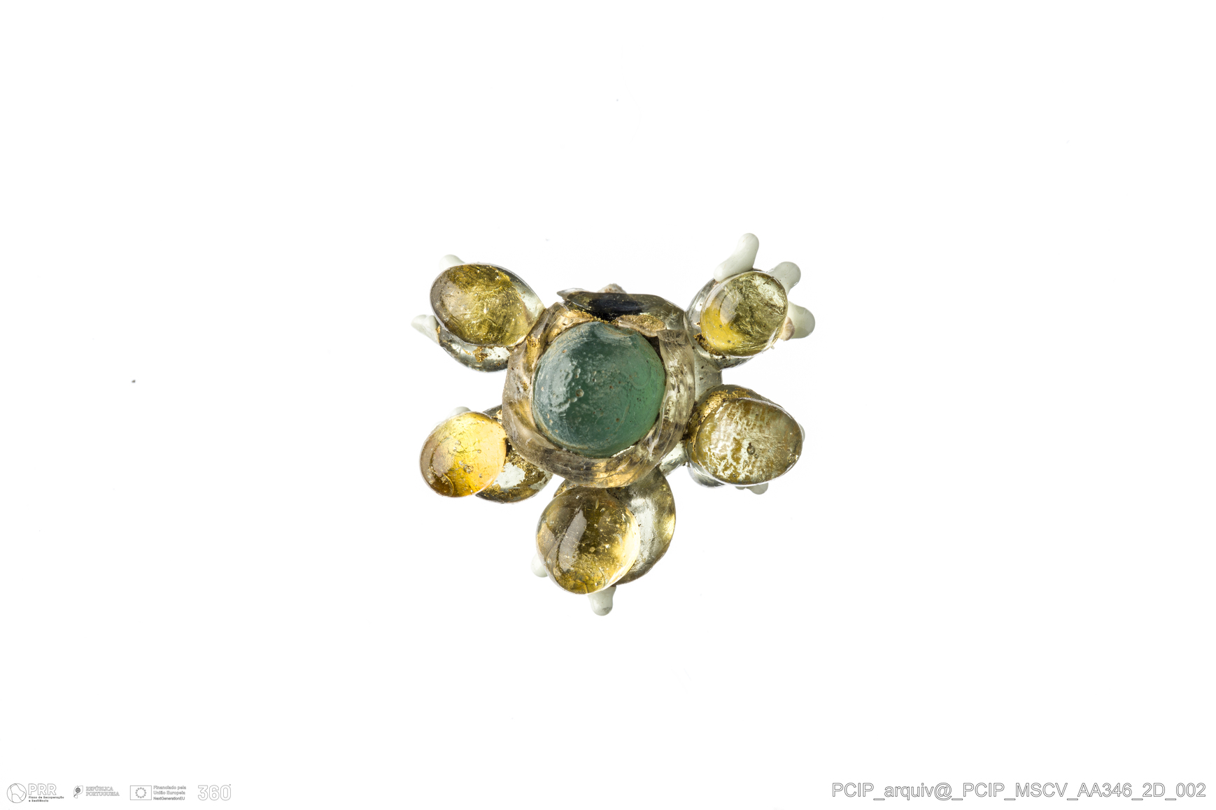 Matéria/Técnica: Vidro; Cronologia: Século XVI- XVII; Autoria: Desconhecida; Dimensões: Comprimento: 12mm; Largura: 12mm; Altura: 6mm.