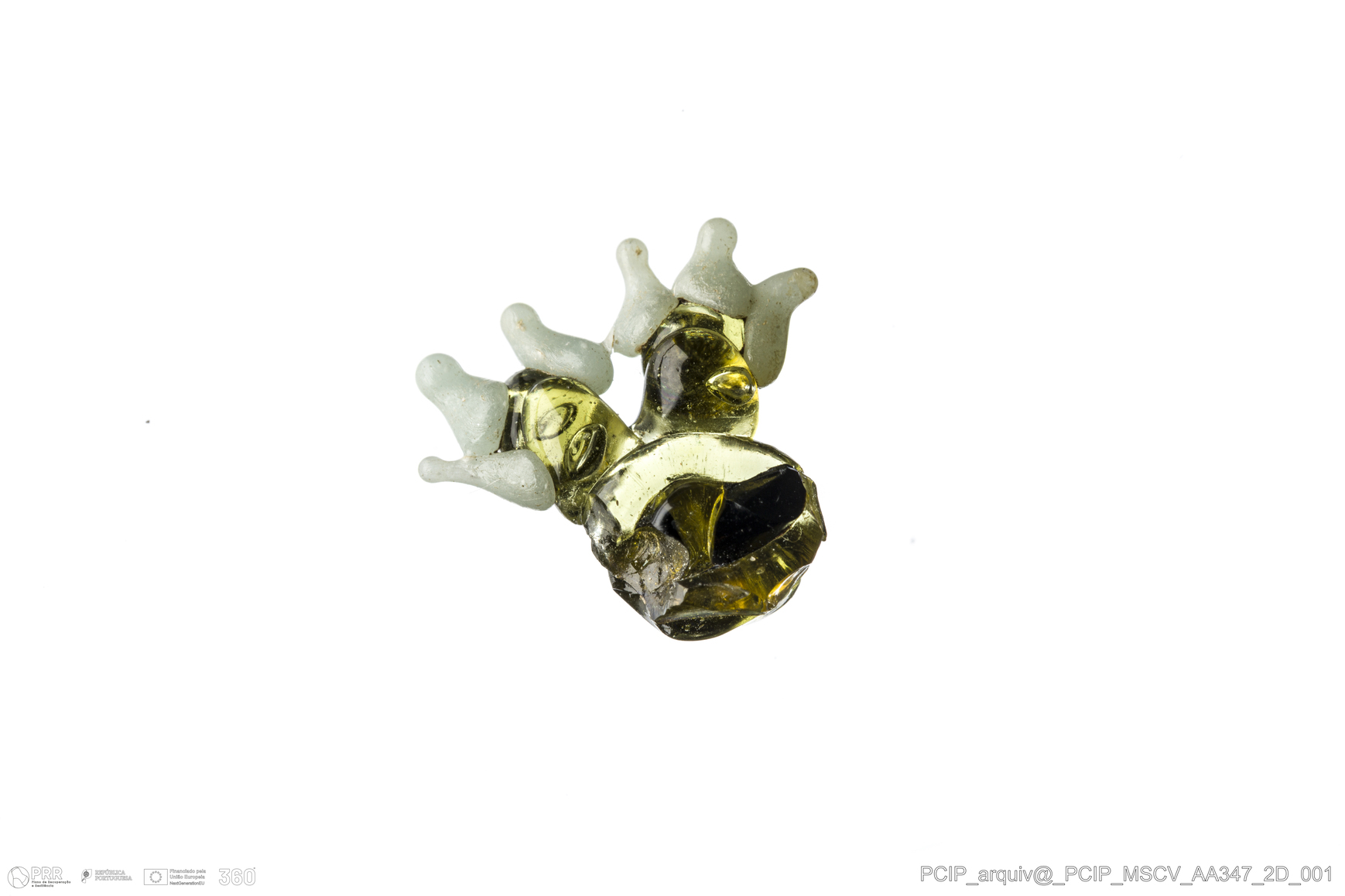 Matéria/Técnica: Vidro; Cronologia: Século XVI- XVII; Autoria: Desconhecida; Dimensões: Comprimento: 11mm; Largura: 12mm; Espessura: 6mm.