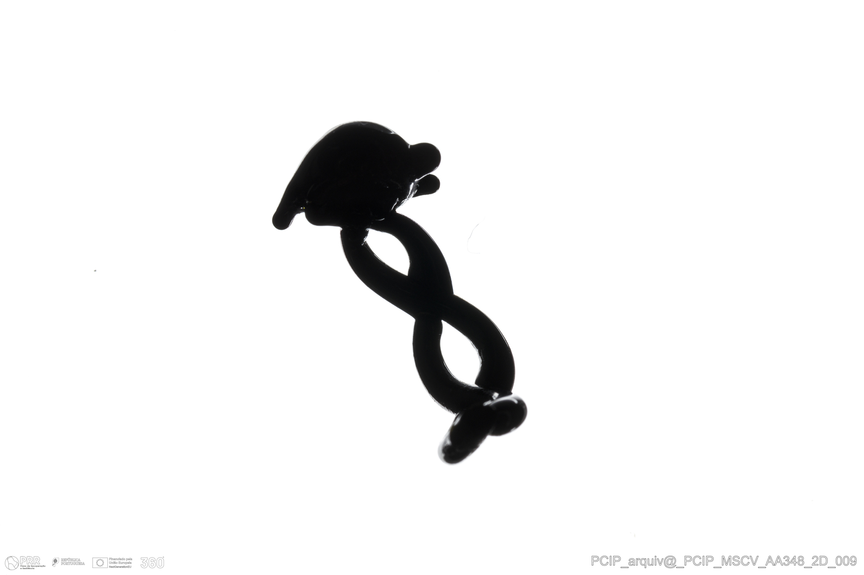 Matéria/Técnica: Vidro; Cronologia: Século XVI-XVII; Autoria: Desconhecida; Dimensões: Altura (coração): 10mm; Diâmetro: 21mm.