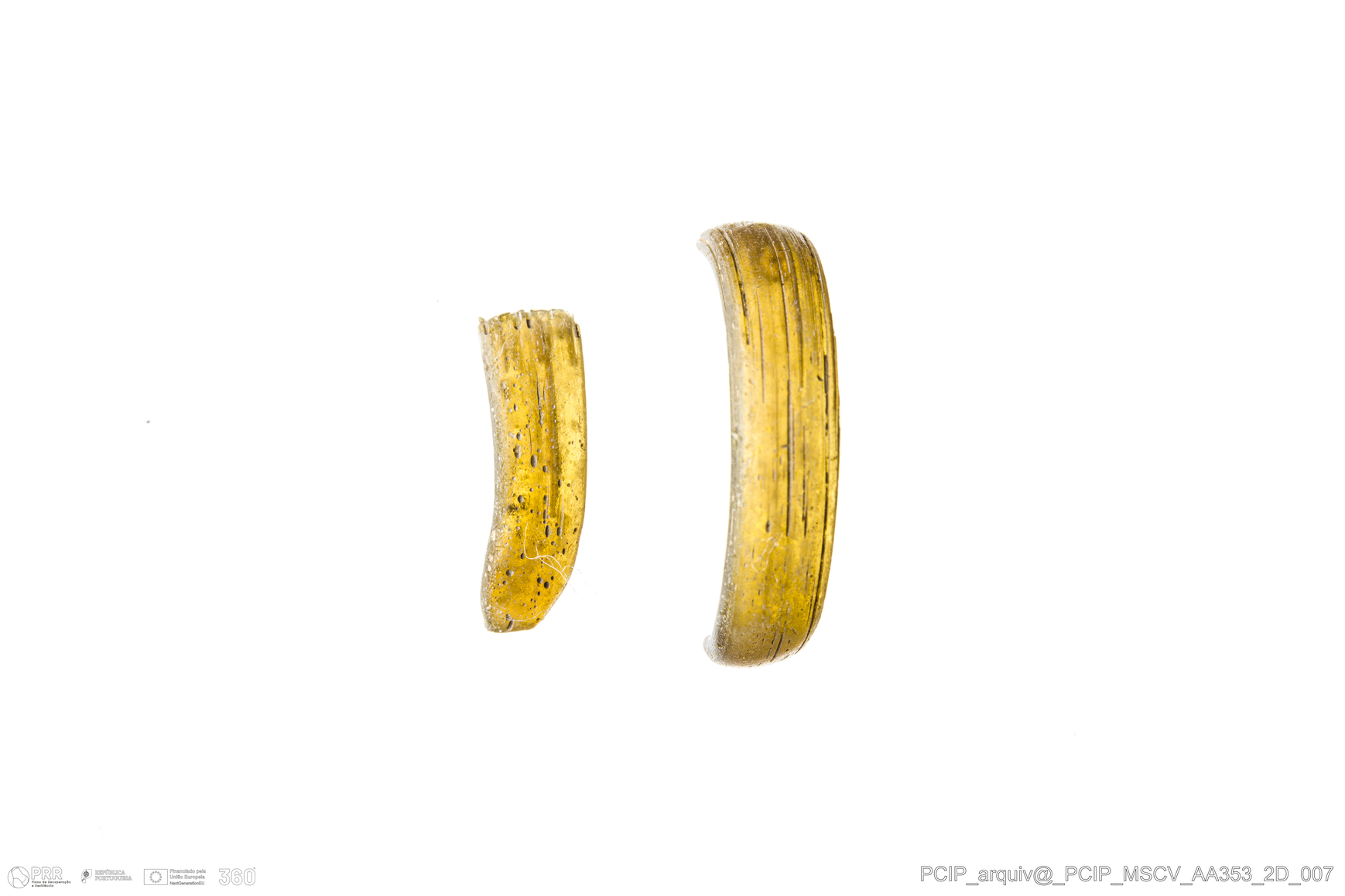Matéria/Técnica: Vidro; Cronologia: Século XVI- XVII; Autoria: Desconhecida; Dimensões: Diâmetro máximo: 18mm; Altura: 4mm; Espessura: 1mm.
