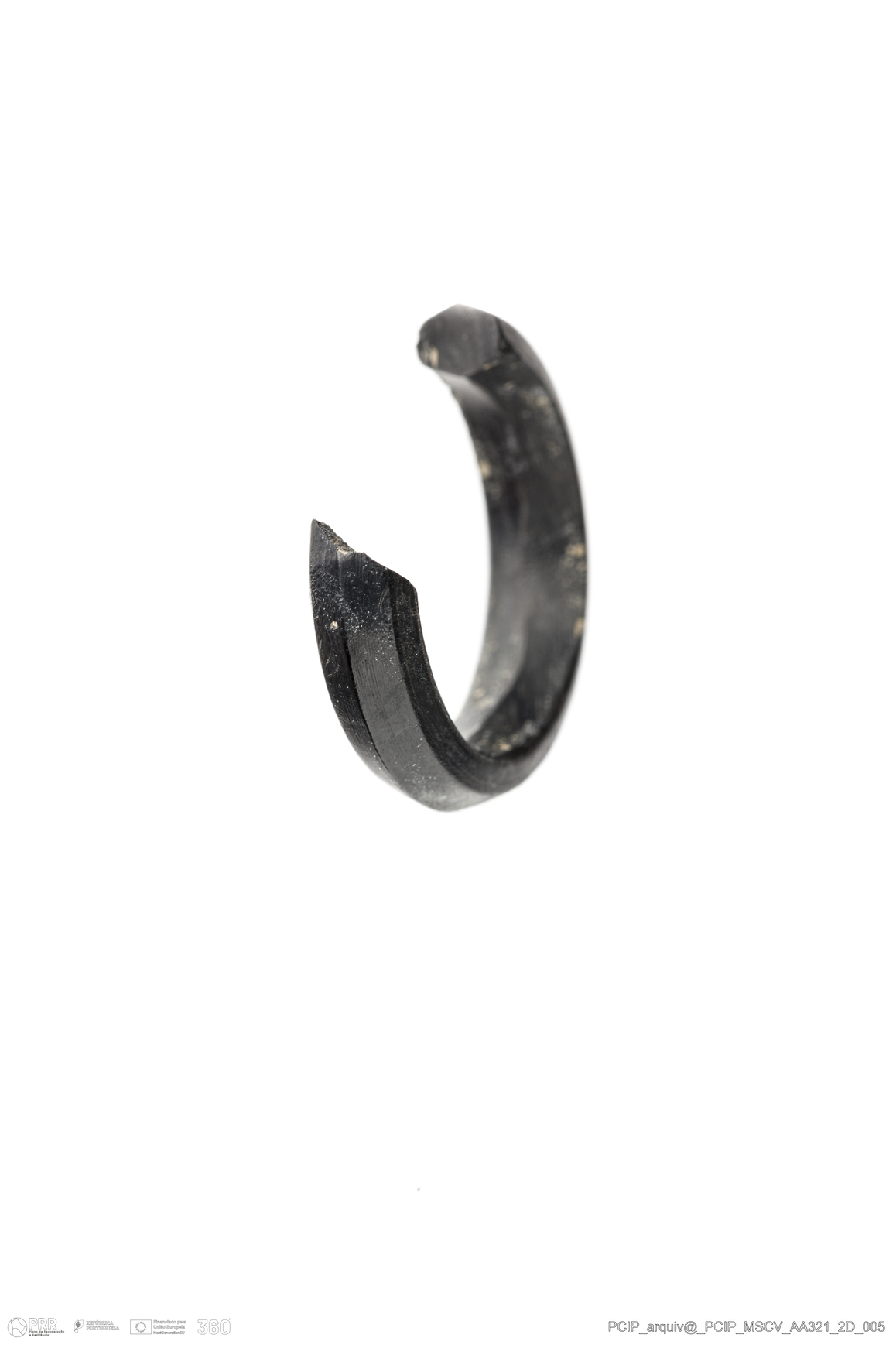 Matéria/Técnica: Azeviche; Cronologia: Século XVI- XVII; Autoria: Desconhecida; Dimensões: Diâmetro máximo: 19mm Altura máxima: 5mm Espessura máxima: 3mm.
