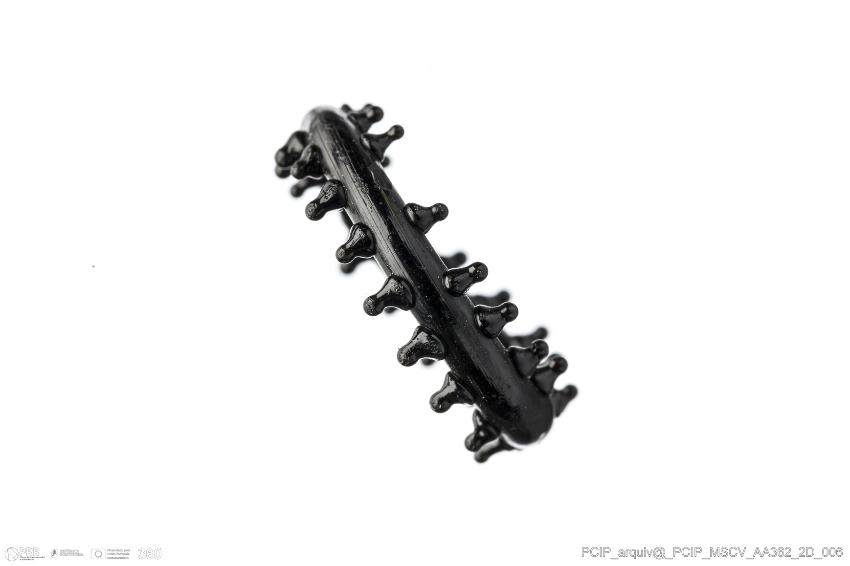 Matéria/Técnica: Vidro; Cronologia: Século XVI-XVII; Autoria: Desconhecida; Dimensões: Diâmetro: 19mm; Altura do aro: 2,5mm.
