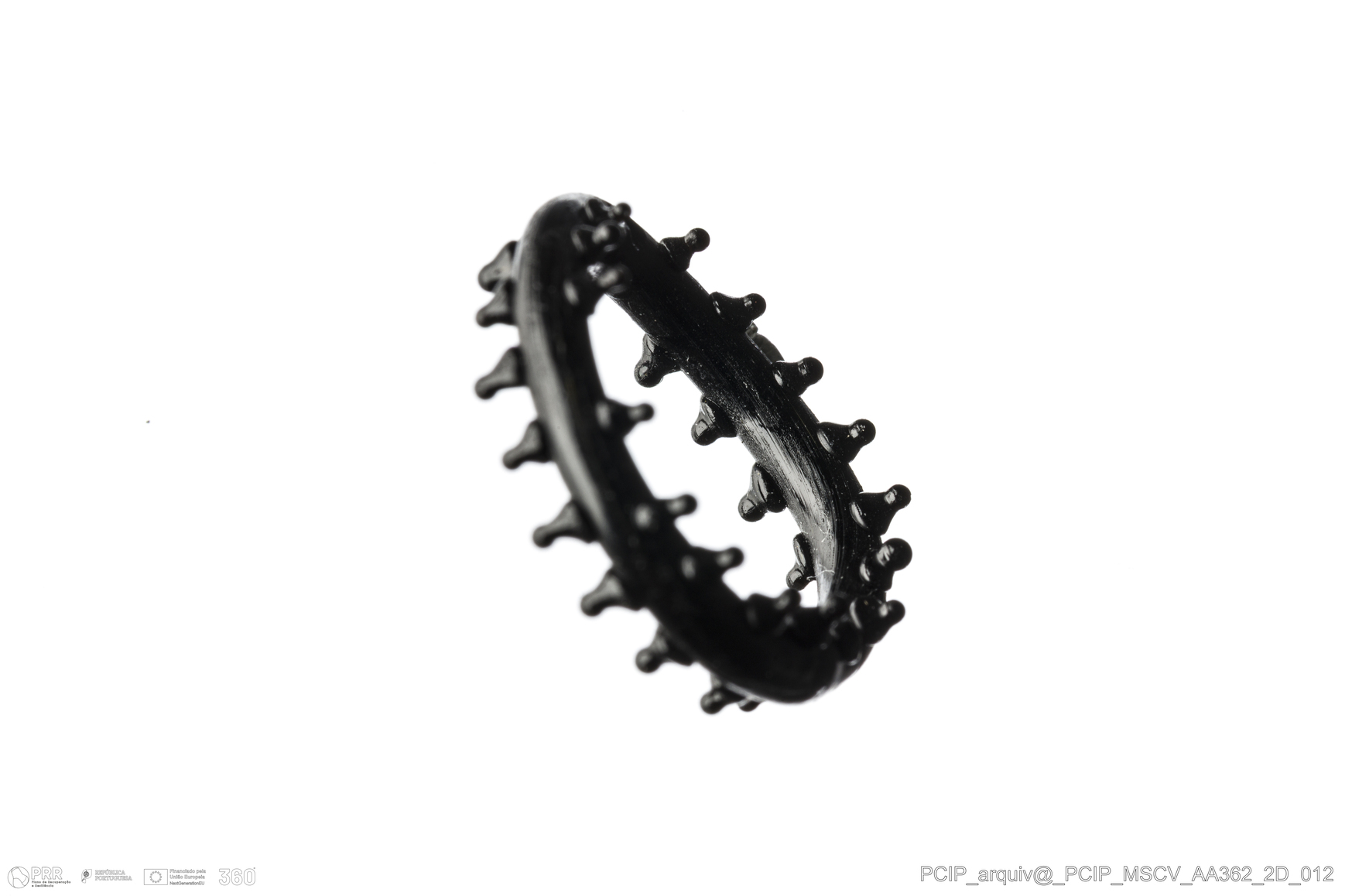 Matéria/Técnica: Vidro; Cronologia: Século XVI-XVII; Autoria: Desconhecida; Dimensões: Diâmetro: 19mm; Altura do aro: 2,5mm.