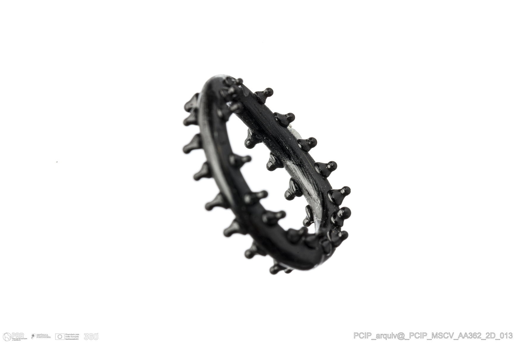 Matéria/Técnica: Vidro; Cronologia: Século XVI-XVII; Autoria: Desconhecida; Dimensões: Diâmetro: 19mm; Altura do aro: 2,5mm.