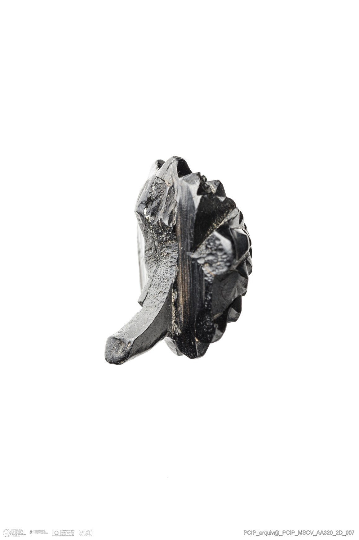 Matéria/Técnica: Azeviche; Cronologia: Século XVI-Século XVII; Autoria: Desconhecida; Dimensões: Remate: Diâmetro: 10,5mm; Espessura: 5mm.