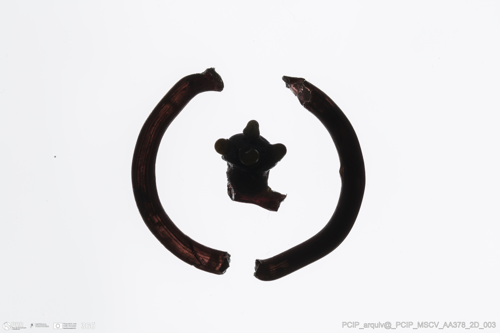 Matéria/Técnica: Vidro; Cronologia: Século XVI- XVII; Autoria: Desconhecida; Dimensões: Diâmetro máximo: 21mm; Altura: 5mm; Espessura: 9mm.