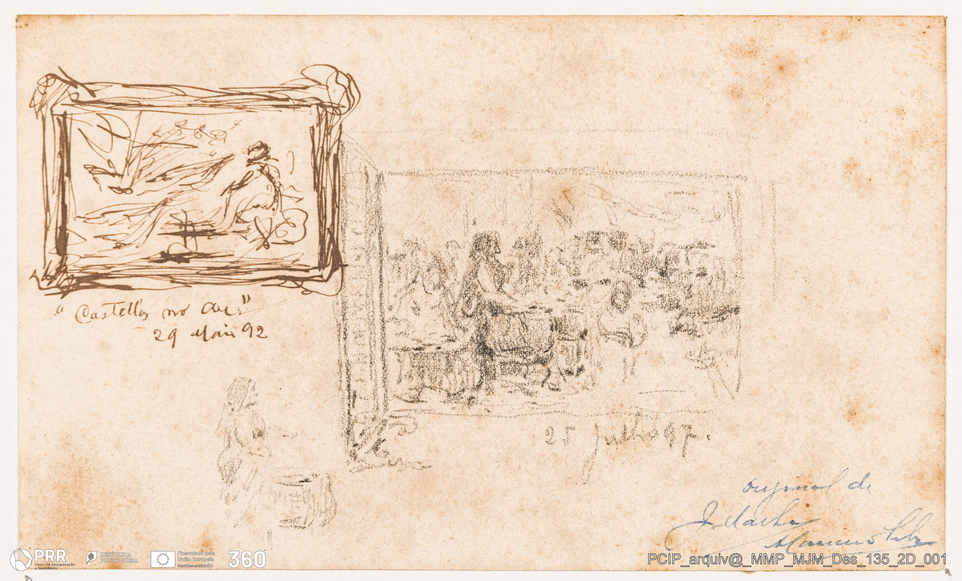 Matéria/Técnica: Lápis e Tinta da China sobre papel; Cronologia: Desconhecida; Autoria: José Malhoa; Dimensões: 8,5 x 14,5 cm.