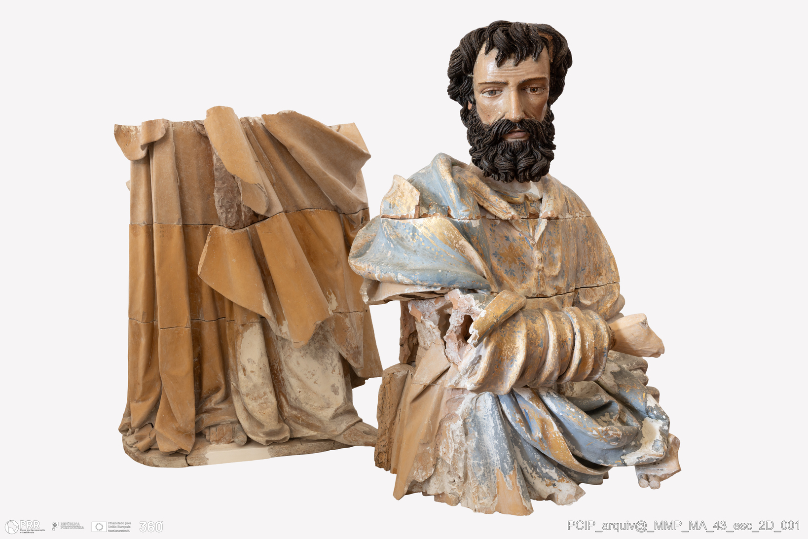Matéria/Técnica: Construção das esculturas de vulto com a sobreposição de tacelos em barro cozido, dourado e policromado; Cronologia: 1670; Autoria: Desconhecida; Dimensões: Altura: 173 cm.