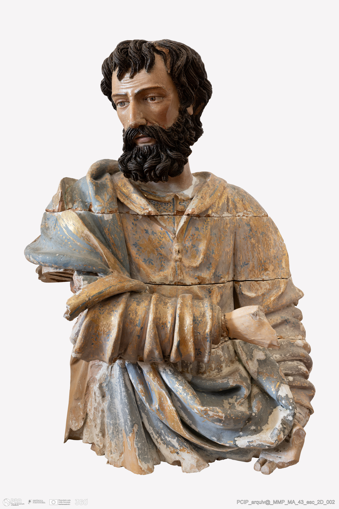 Matéria/Técnica: Construção das esculturas de vulto com a sobreposição de tacelos em barro cozido, dourado e policromado; Cronologia: 1670; Autoria: Desconhecida; Dimensões: Altura: 173 cm.
