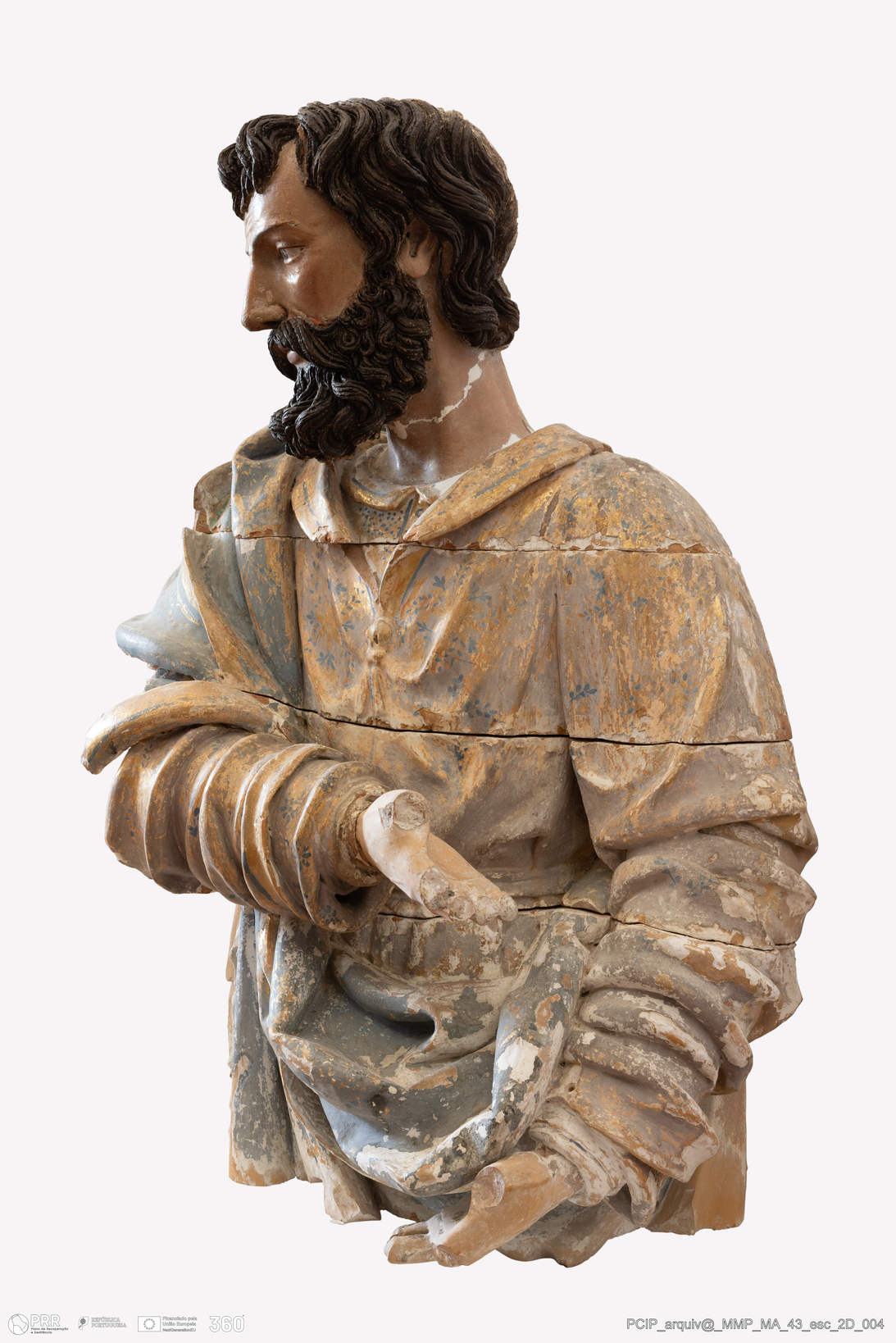 Matéria/Técnica: Construção das esculturas de vulto com a sobreposição de tacelos em barro cozido, dourado e policromado; Cronologia: 1670; Autoria: Desconhecida; Dimensões: Altura: 173 cm.