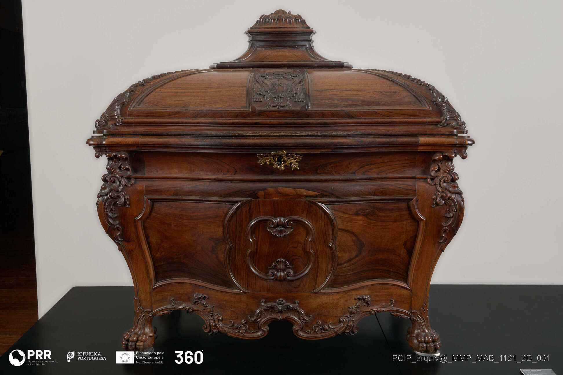 Matéria/Técnica: A arca é construída em madeira maciça de pau-santo com samblagens escondidas do tipo "furo e respiga" e a tampa é fixada com cola animal e cavilhas de pau-santo. Possui no interior, a meia altura, uma prancha com três aberturas circulares que servem para colocar as âmbulas. O acabamento de superfície é envernizado com polimento a goma-laca e aplicação de cera de abelha; Cronologia: Desconhecida; Autoria: Desconhecida; Dimensões: Desconhecidas.