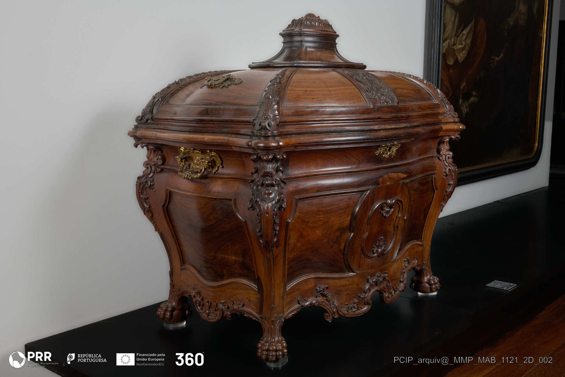 Matéria/Técnica: A arca é construída em madeira maciça de pau-santo com samblagens escondidas do tipo "furo e respiga" e a tampa é fixada com cola animal e cavilhas de pau-santo. Possui no interior, a meia altura, uma prancha com três aberturas circulares que servem para colocar as âmbulas. O acabamento de superfície é envernizado com polimento a goma-laca e aplicação de cera de abelha; Cronologia: Desconhecida; Autoria: Desconhecida; Dimensões: Desconhecidas.