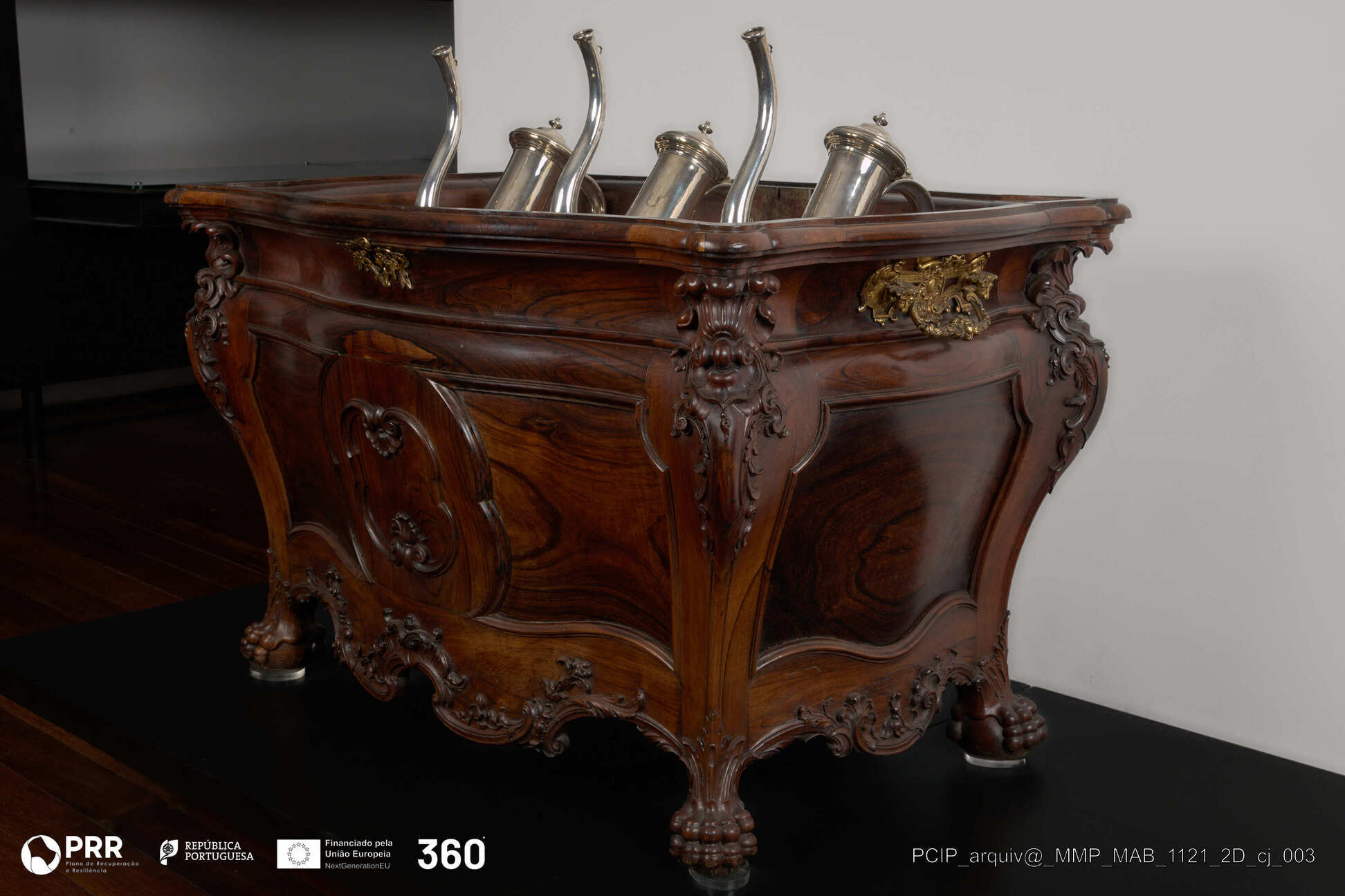 Matéria/Técnica: A arca é construída em madeira maciça de pau-santo com samblagens escondidas do tipo "furo e respiga" e a tampa é fixada com cola animal e cavilhas de pau-santo. Possui no interior, a meia altura, uma prancha com três aberturas circulares que servem para colocar as âmbulas. O acabamento de superfície é envernizado com polimento a goma-laca e aplicação de cera de abelha; Cronologia: Desconhecida; Autoria: Desconhecida; Dimensões: Desconhecidas.