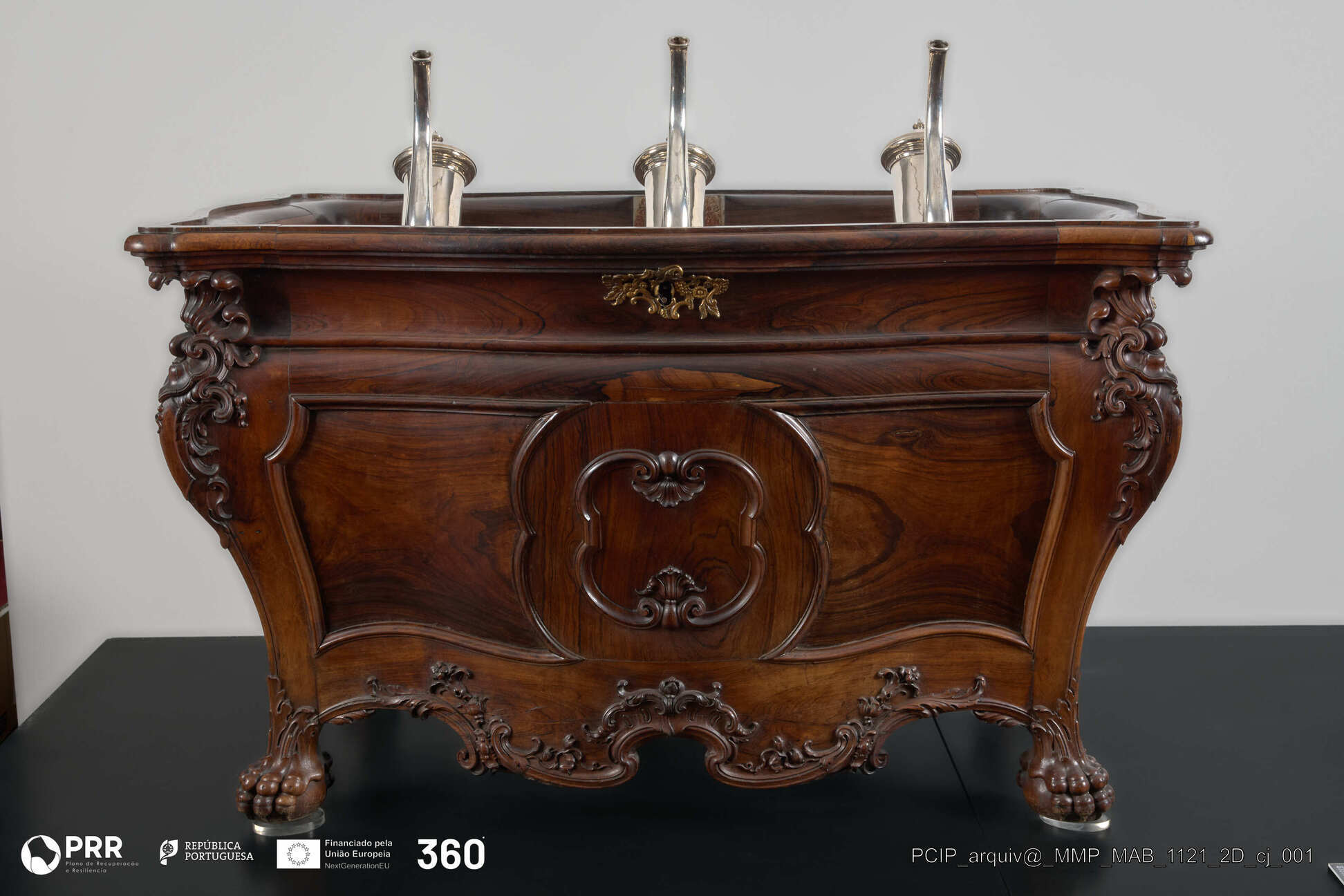 Matéria/Técnica: A arca é construída em madeira maciça de pau-santo com samblagens escondidas do tipo "furo e respiga" e a tampa é fixada com cola animal e cavilhas de pau-santo. Possui no interior, a meia altura, uma prancha com três aberturas circulares que servem para colocar as âmbulas. O acabamento de superfície é envernizado com polimento a goma-laca e aplicação de cera de abelha; Cronologia: Desconhecida; Autoria: Desconhecida; Dimensões: Desconhecidas.