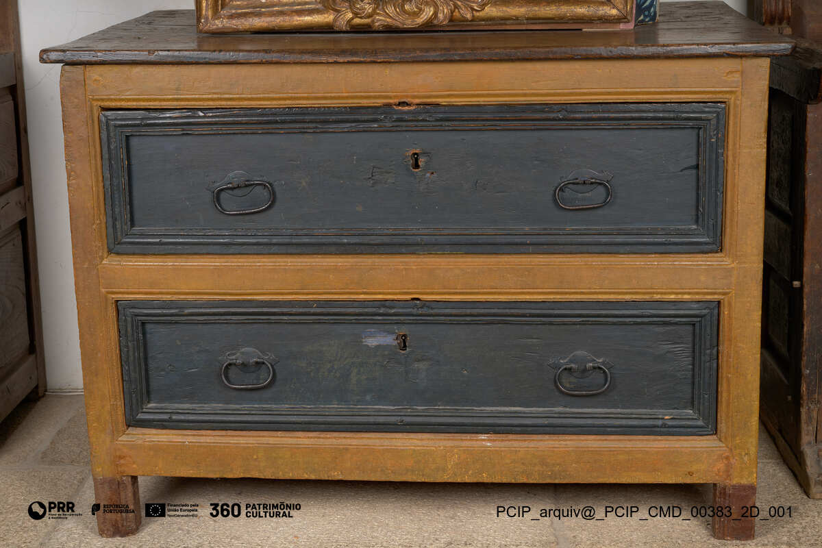 Matéria/Técnica: Madeira e ferro; Cronologia: XVII; Autoria: Desconhecida; Dimensões: Altura: 94 cm; Largura: 130 cm; Profundidade: 90,5 cm.