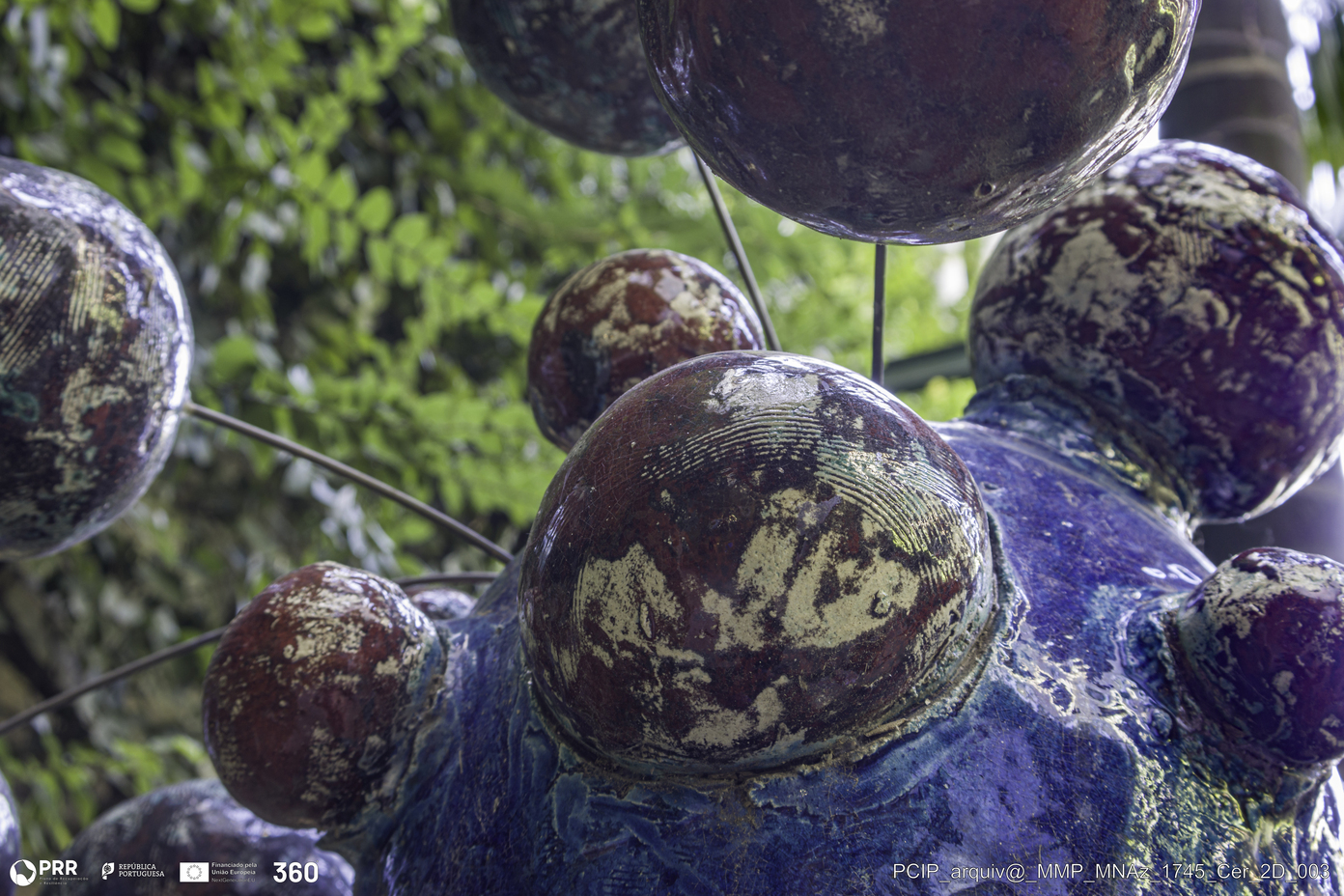 Matéria/Técnica: Grés vidrado c/esferas de selénio e arame de latão; Cronologia: 2022; Autoria: A.Vasconcelos Lapa; Dimensões: Altura: 2,10 cm x Largura: 40 cm.