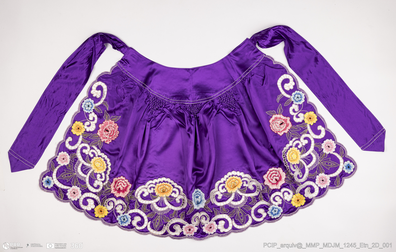 Matéria/Técnica: Cetim; Cronologia: Séc. XX; Autoria: Desconhecida; Dimensões: Altura: 78 cm x Roda: 266 cm.