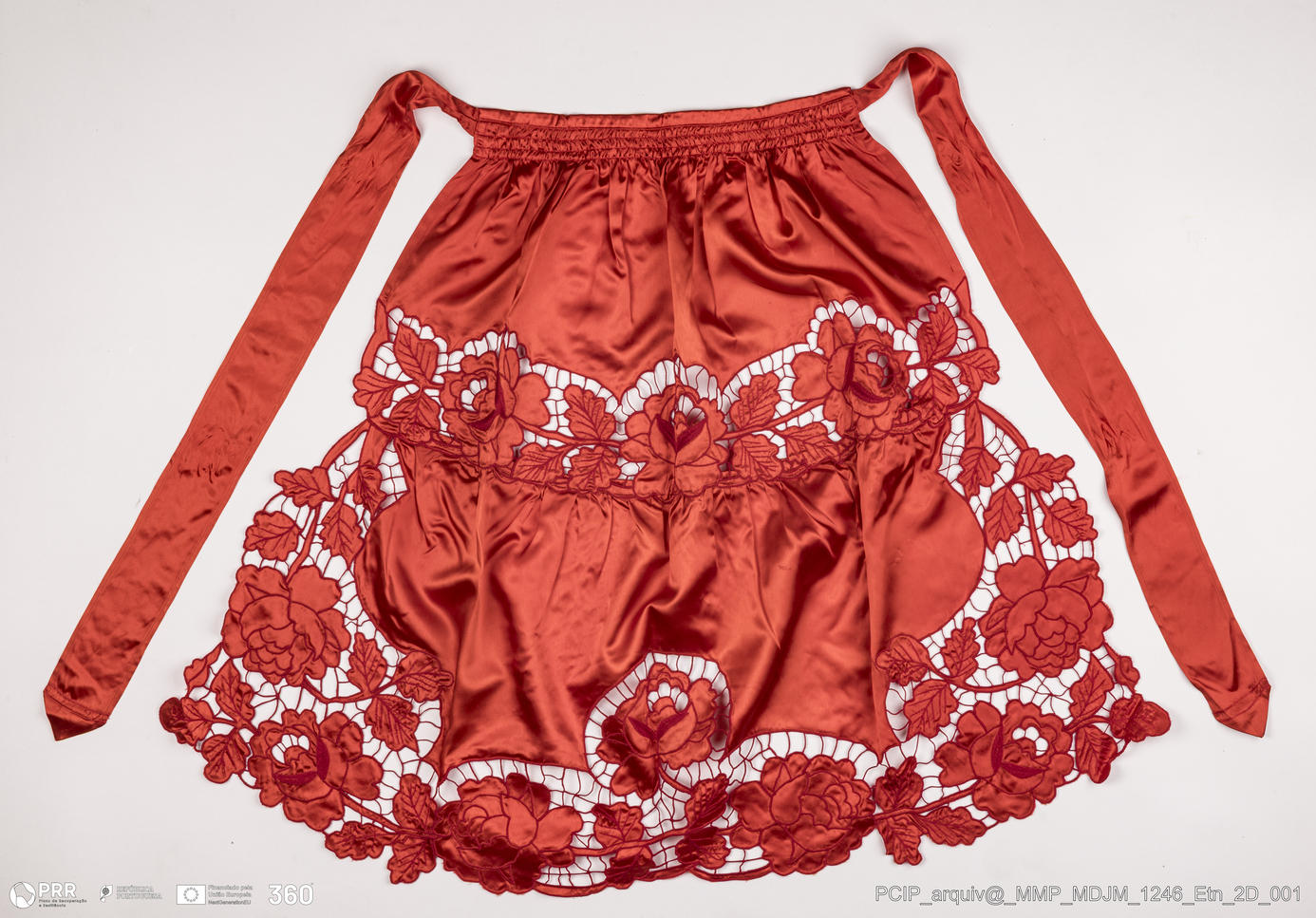 Matéria/Técnica: Cetim; Cronologia: Séc. XX; Autoria: Maria Manuela Conde; Dimensões: Altura: 78 cm x Roda: 266 cm.