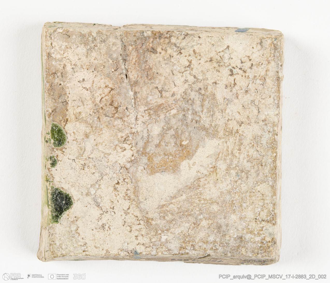 Matéria/Técnica: Cerâmica de revestimento; Cronologia: Desconhecida; Autoria: Desconhecida; Dimensões: Comprimento: 100mm; Largura: 100mm; Espessura: 20mm.