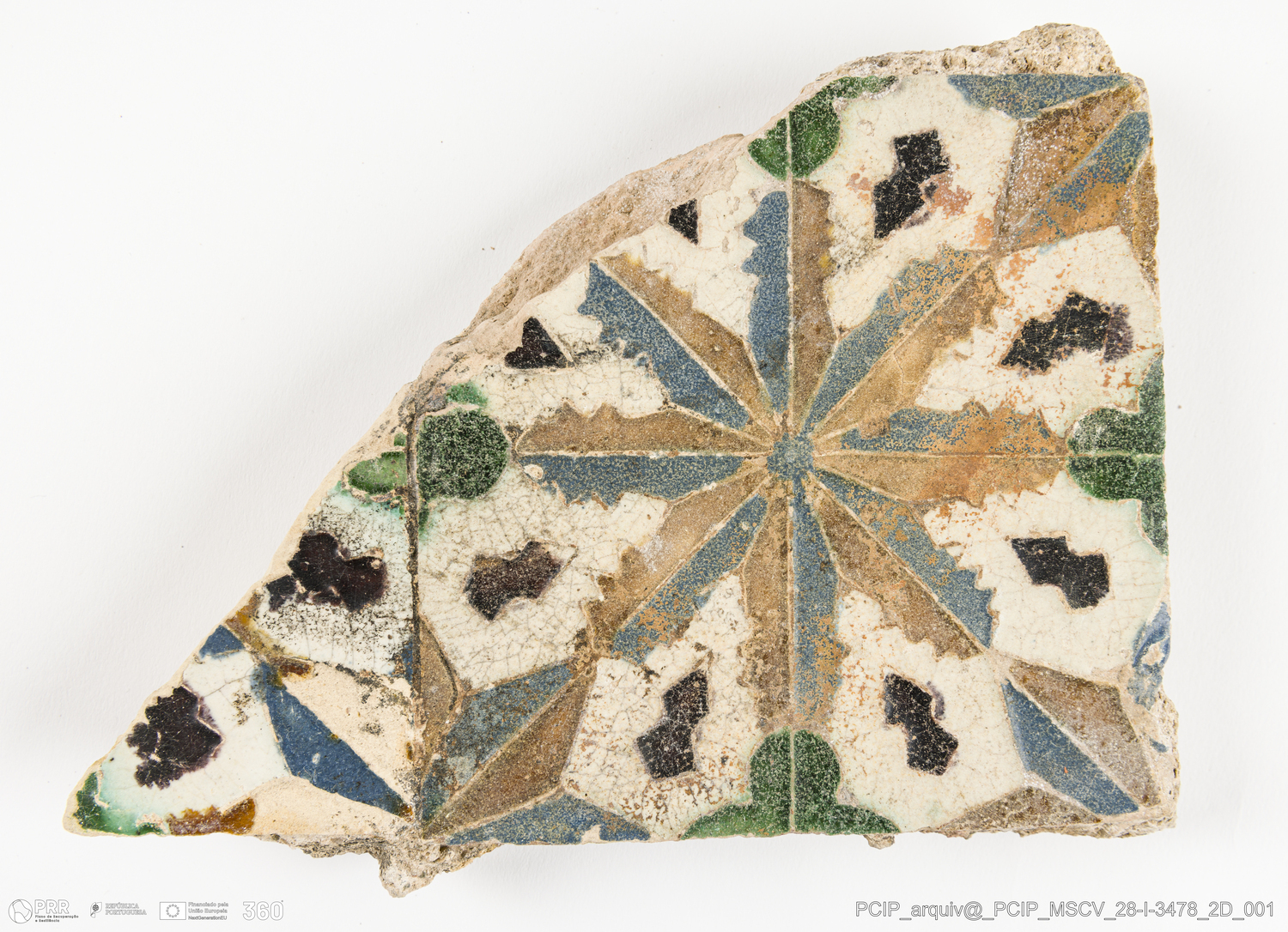 Matéria/Técnica: Cerâmica de revestimento; Cronologia: Século XVI; Autoria: Desconhecida; Dimensões: Comprimento: 135mm; Largura: 133mm; Espessura: 20mm.