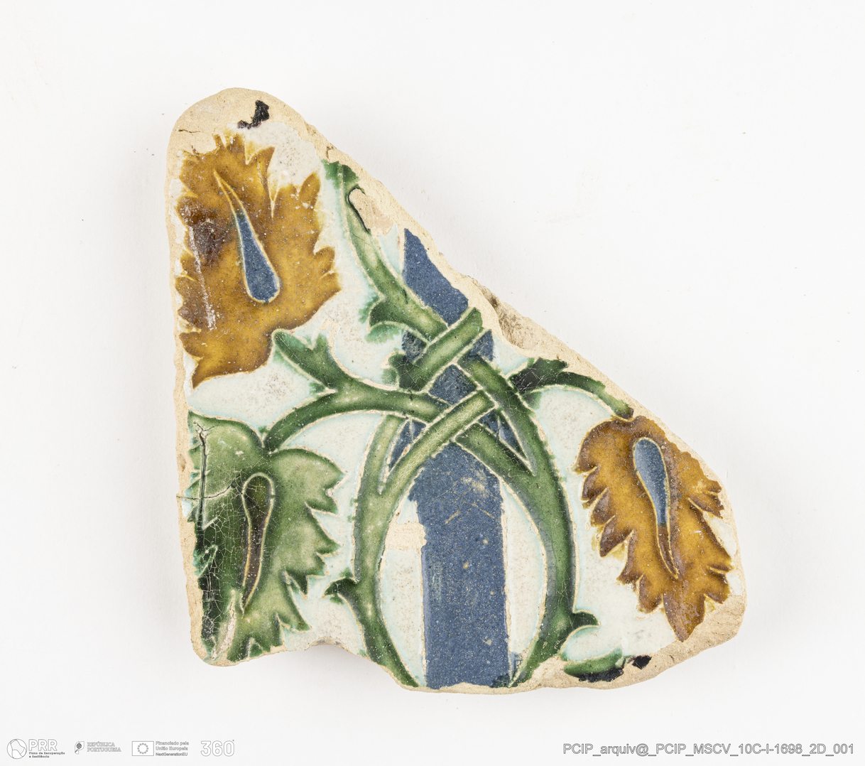 Matéria/Técnica: Cerâmica de revestimento; Cronologia: Século XVI; Autoria: Desconhecida; Dimensões: Comprimento: 130mm; Largura: 126mm; Espessura:23mm.