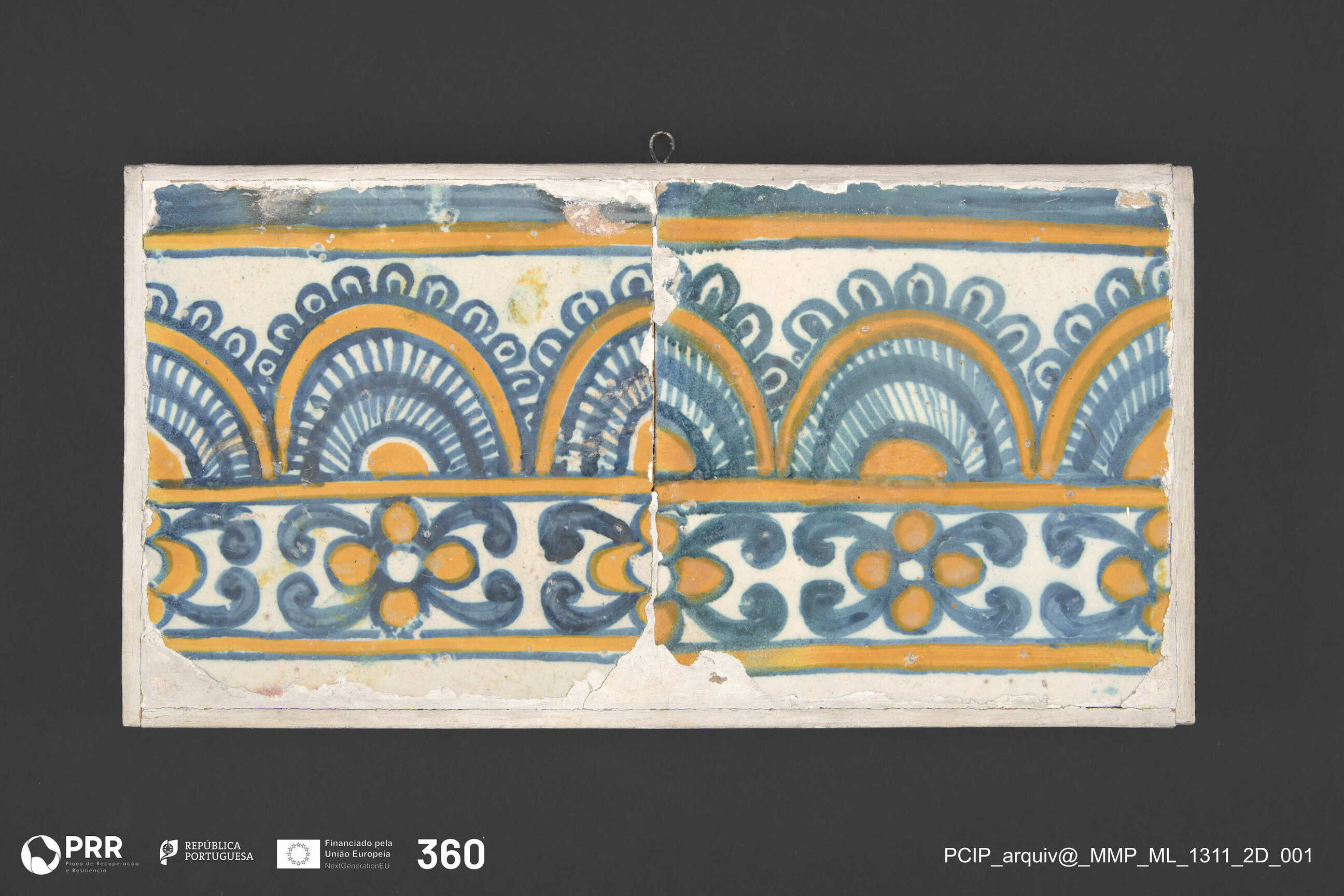 Matéria/Técnica: Majólica policroma; Cronologia: Século XVII; Autoria: Desconhecida; Dimensões (cm): Altura: 14 x Largura: 28.