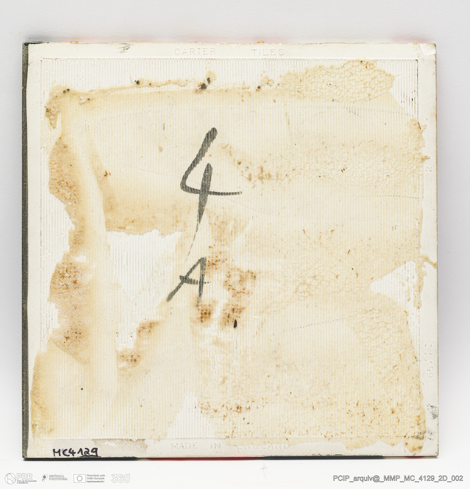 Matéria/Técnica: Barro branco moldado. Vidrado polícromo: preto, castanho, azul, vermelho, laranja e amarelo; Cronologia: século XX; Autoria: Desconhecido / Inglaterra; Dimensões (cm): Largura: 15,3; Comprimento: 15,3.
