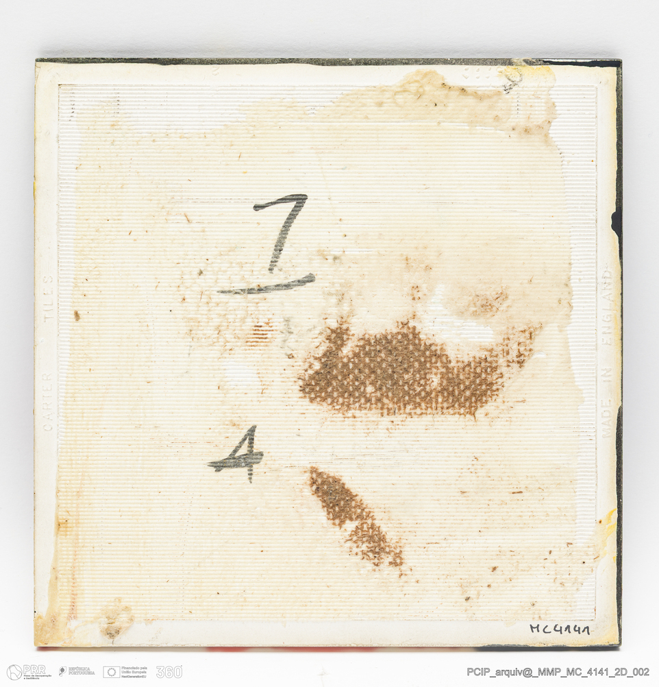 Matéria/Técnica: Barro branco moldado. Vidrado polícromo: preto, castanho, azul, vermelho e amarelo; Cronologia: século XX; Autoria: Desconhecido / Inglaterra; Dimensões (cm): Largura: 15,5; Comprimento: 15,5.