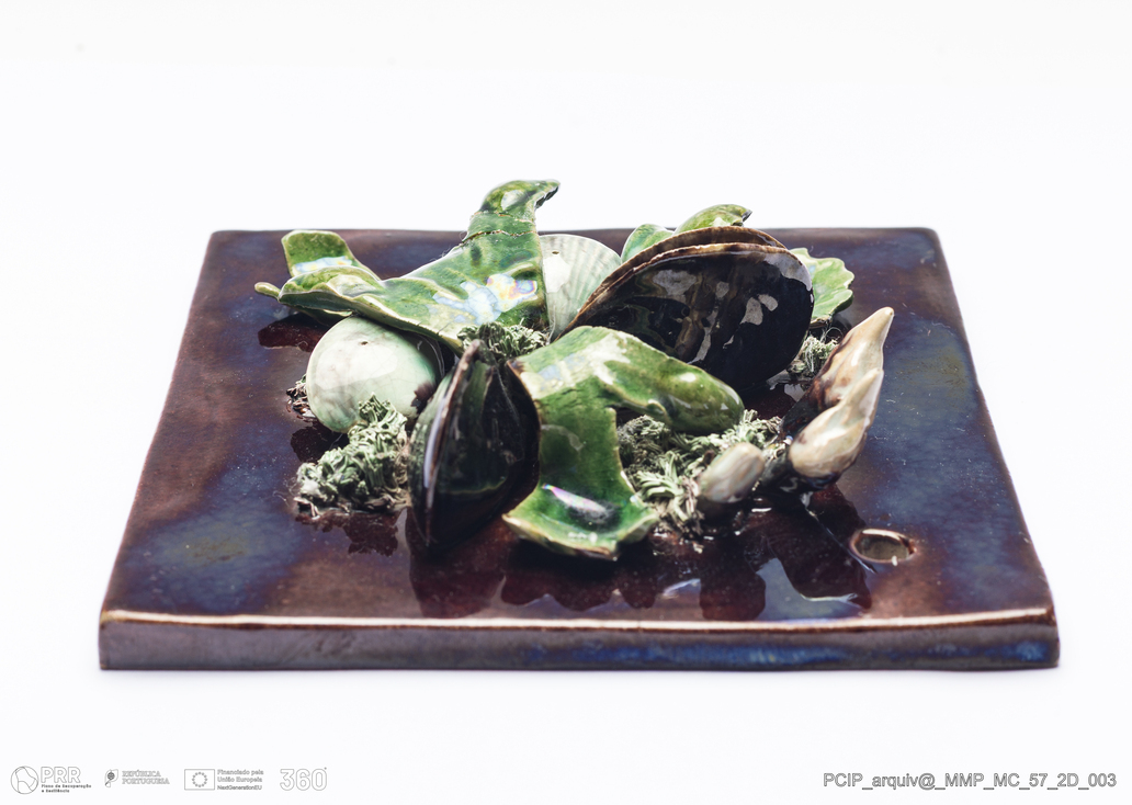 Matéria/Técnica: Barro vermelho modelado e moldado. Musgados. Vidrado polícromo: preto, castanho escuro e mel, verde, cinzento, azul e branco; Cronologia: 1902; Autoria: Rafael Bordalo Pinheiro / Fábrica de Faianças das Caldas da Rainha, Portugal; Dimensões (cm): Altura: 13,6; Largura: 13,4.