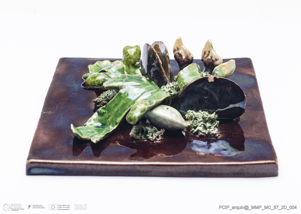 Matéria/Técnica: Barro vermelho modelado e moldado. Musgados. Vidrado polícromo: preto, castanho escuro e mel, verde, cinzento, azul e branco; Cronologia: 1902; Autoria: Rafael Bordalo Pinheiro / Fábrica de Faianças das Caldas da Rainha, Portugal; Dimensões (cm): Altura: 13,6; Largura: 13,4.