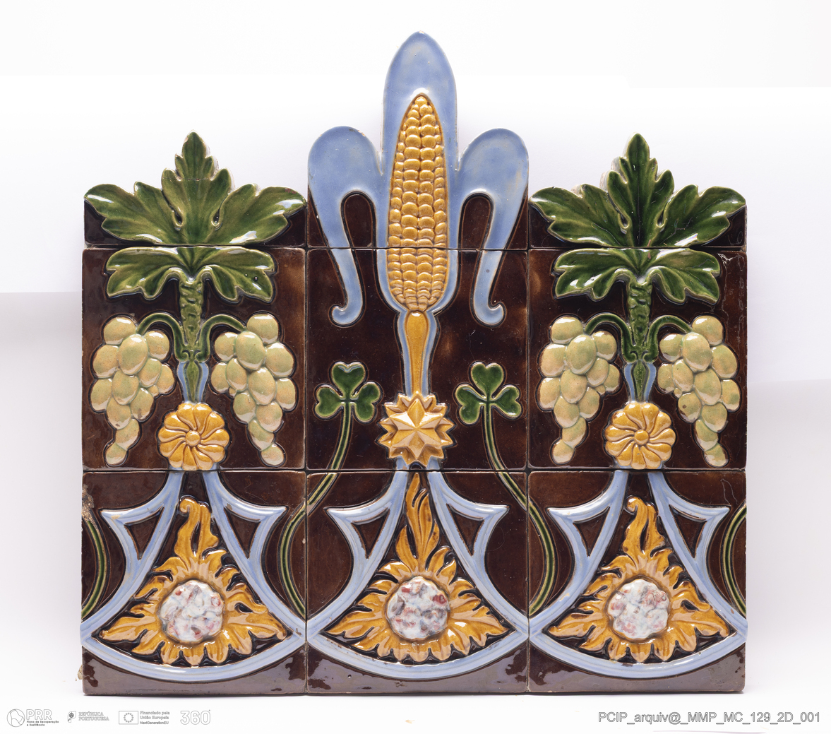 Matéria/Técnica: Barro vermelho moldado. Vidrado polícromo : preto, castanho escuro e mel, azul e amarelo; Cronologia: 1893-1905; Autoria: Rafael Bordalo Pinheiro / Fábrica de Faianças das Caldas da Rainha, Portugal; Dimensões (cm): Altura: 40; Largura: 40.
