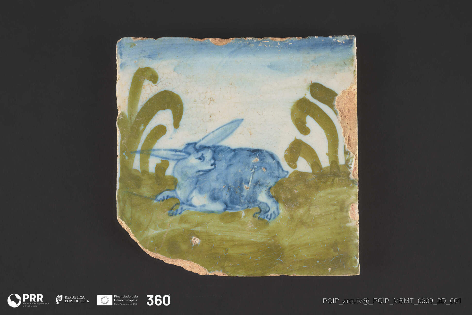 Matéria/Técnica: Cerâmica vidrada,pigmentos / Pintura azulejar; Cronologia: Séc. XVII; Autoria: Desconhecido; Dimensões (cm): 14 x 14.