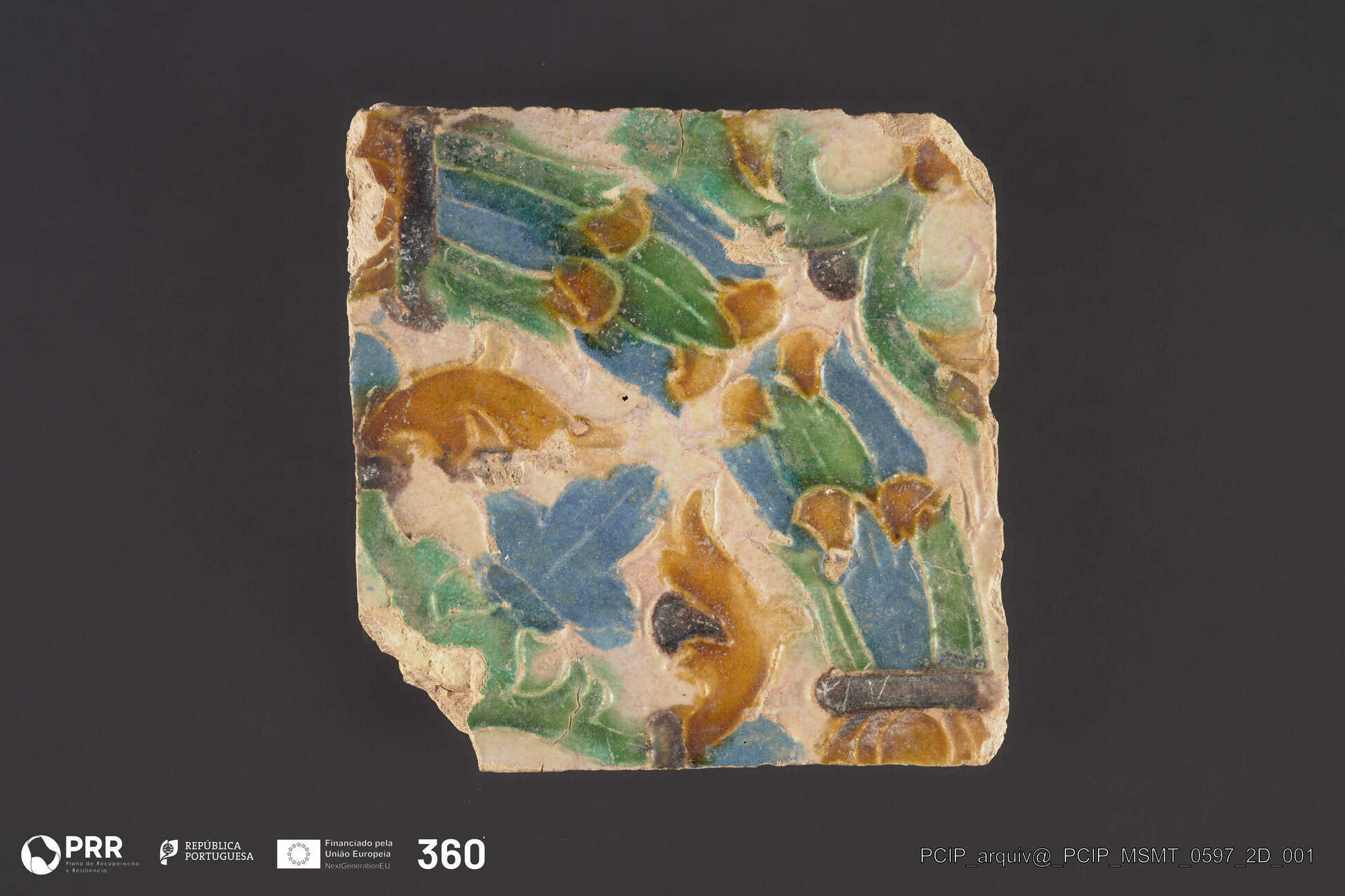 Matéria/Técnica: Cerâmica vidrada,pigmentos / Pintura azulejar; Cronologia: Séc. XV - XVI; Autoria: Desconhecido; Dimensões (cm): 13 x 13.