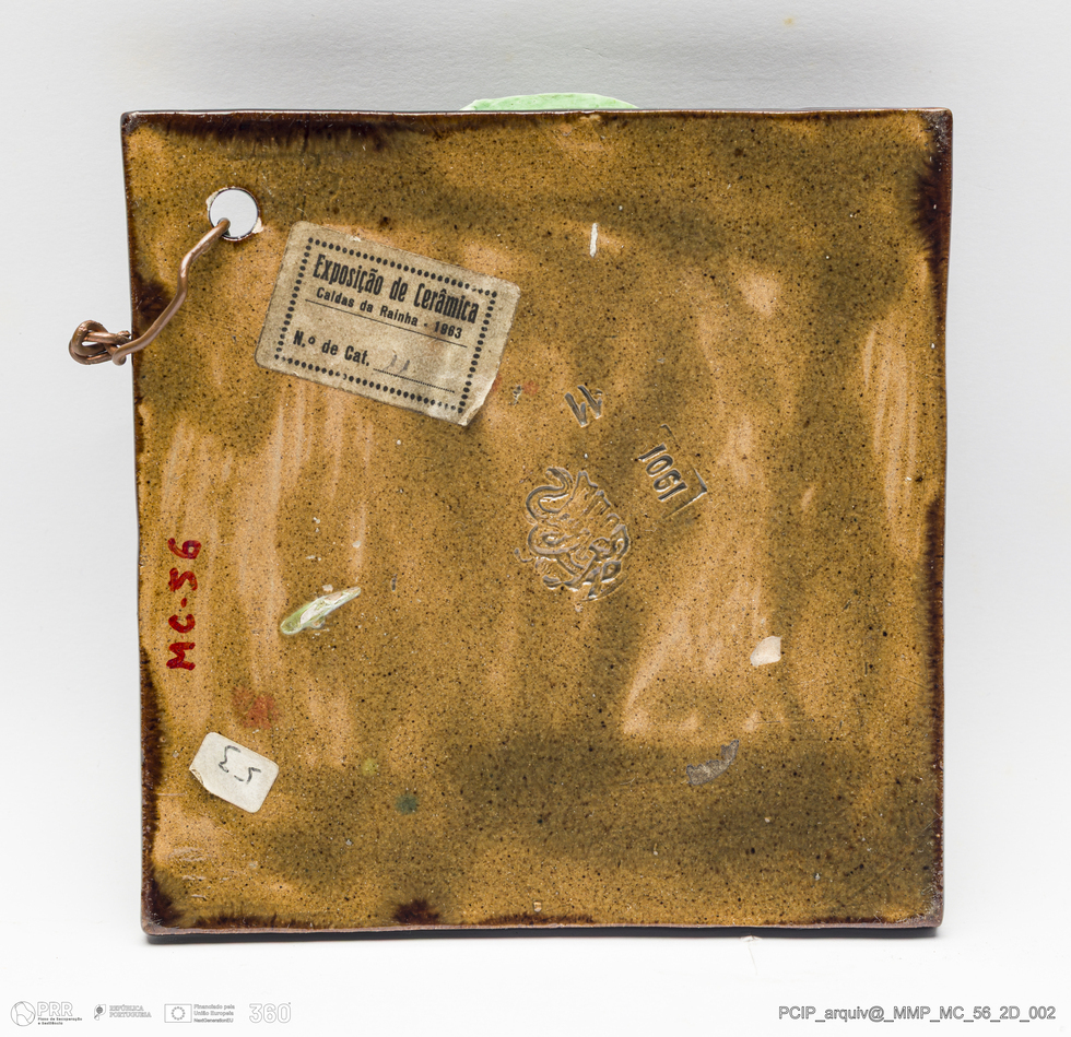 Matéria/Técnica: Barro vermelho modelado e moldado. Vidrado polícromo: castanho escuro e mel, verde e vermelho; Cronologia: 1901; Autoria: Rafael Bordalo Pinheiro / Fábrica de Faianças das Caldas da Rainha, Portugal; Dimensões (cm): Altura: 13,5; Largura: 13.