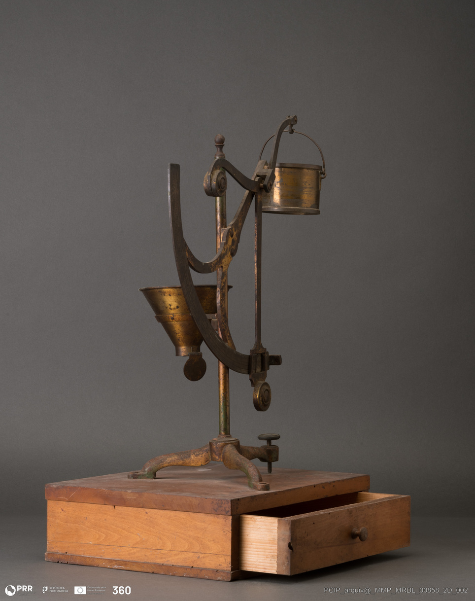 Matéria/Técnica: Latão e madeira; Cronologia: Desconhecida; Autoria: Desconhecida; Dimensões: Altura: 54,00 cm; Largura: 27,90 cm; Comprimento: 35,90 cm.