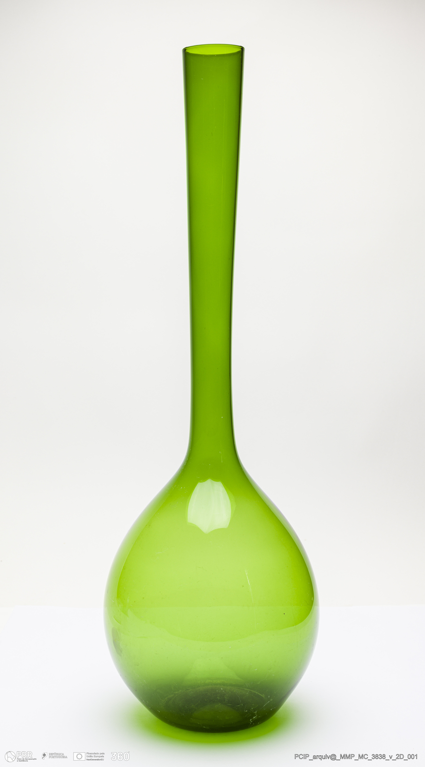 Matéria/Técnica: Vidro verde; Cronologia: século XX; Autoria: Desconhecido / Gullaskruft /Suécia; Dimensões (cm): Altura: 50; Diâmetro: 16,5.