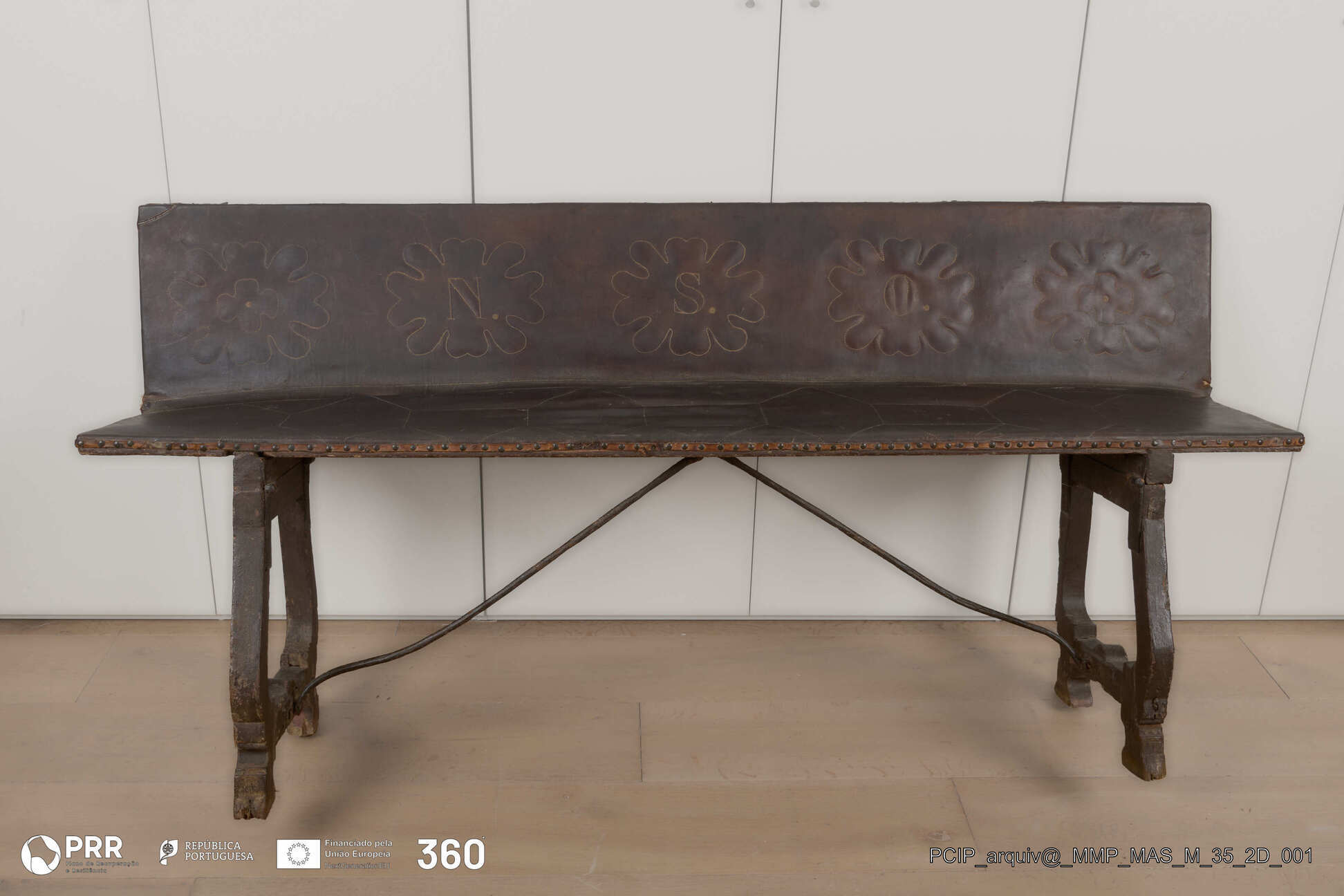 Matéria/Técnica: Castanho pintado; assento estofado e revestido de couro pespontado, fixado por tira de couro e pregaria.; Cronologia: Século XVII; Autoria: Desconhecida; Dimensões: Altura: 84,5 cm x Largura: 44 cm x Comprimento: 175 cm.