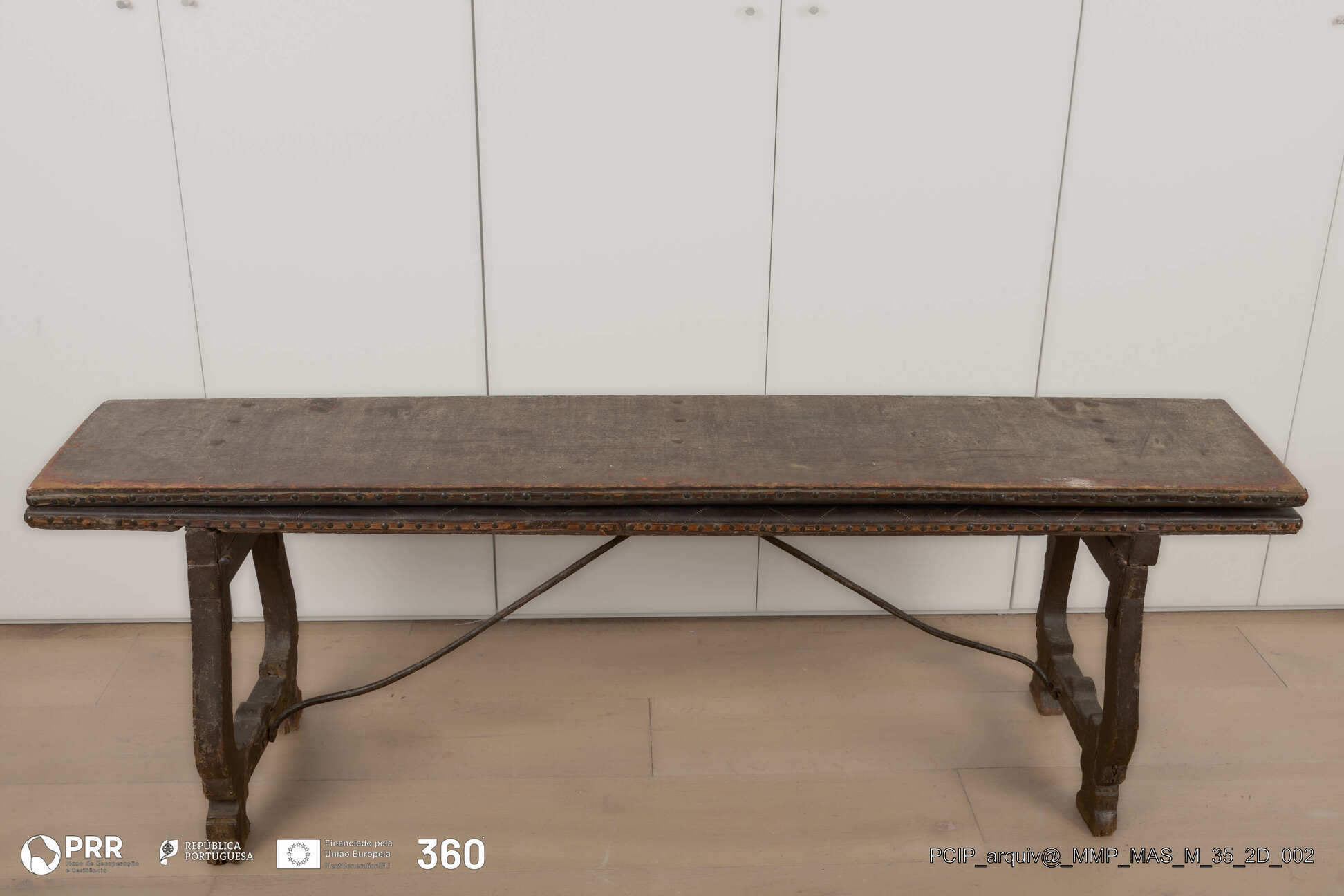 Matéria/Técnica: Castanho pintado; assento estofado e revestido de couro pespontado, fixado por tira de couro e pregaria.; Cronologia: Século XVII; Autoria: Desconhecida; Dimensões: Altura: 84,5 cm x Largura: 44 cm x Comprimento: 175 cm.